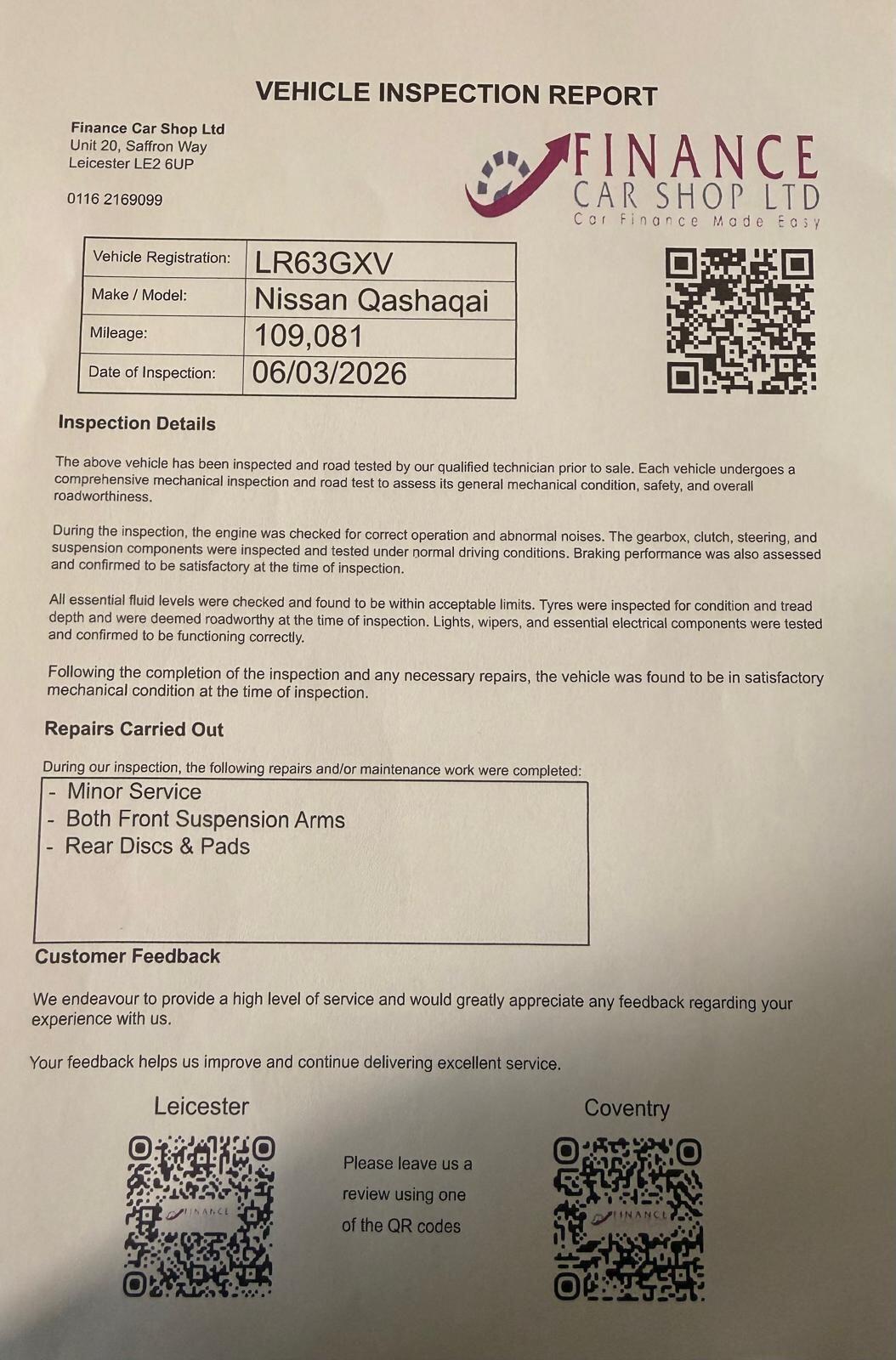 LeicesterInsurance Group 16, Looking for a reliable and versatile SUV? This Nissan Qashqai 1.6 360 2WD combines comfort, practicality, and style, making it perfect for family journeys, city driving, or weekend adventures. With its spacious interior and modern features, its an ideal choice for anyone needing room, reliability, and efficiency.Key Features:1.6L Petrol Engine Smooth, efficient, and reliable2WD Manual Transmission Responsive driving and excellent fuel economyEuro 5 Compliant Reduced emissions and low running costs5 Doors Easy access for passengers and luggagePanoramic Sunroof Enjoy natural light and a sense of spaceBluetooth & USB Connectivity Stay connected on the moveAir Conditioning Comfort for all passengersCruise Control & Steering Wheel ControlsAlloy Wheels Stylish and modern appearanceSpacious Boot Perfect for shopping, luggage, or family tripsWhy Choose This Qashqai?Comfortable familyfriendly SUVLow running costs and reliable performancePractical 5door design with plenty of storageWellmaintained and ready for the road+ 6 MONTHS WARRANTY INCLUDED + 6 MONTHS BREAKDOWN COVER + EXTENDED WARRANTY AVAILABLE + FINANCE OPTIONS AVAILABLE UPON REQUEST + DELIVERY CAN ONLY BE ARRANGED ONCE THE VEHICLE HAS BEEN VIEWED & INSPECTED IN PERSON AT OUR PREMISES + PHOTO ID IS REQUIRED FOR ALL VIEWINGS AND TEST DRIVES + WE CAN BE REACHED VIA WHATSAPP ON 07458 300017 FEEL FREE TO MESSAGE US + PLEASE NOTE, THE PRICE IS FIXED ON THIS VEHICLE. KINDLY BE AWARE OF THIS PRIOR TO ARRANGING A VIEWING + WE HAVE OVER 50 VEHICLES IN STOCK. AS NOT ALL VEHICLES ARE HELD ON SITE, PLEASE ENSURE YOU CALL IN ADVANCE BEFORE MAKING YOUR JOURNEY + BANK TRANSFER ONLY + MORE CARS AVAILABLE AT:WWW.FINANCECARSHOPLTD.CO.UK +