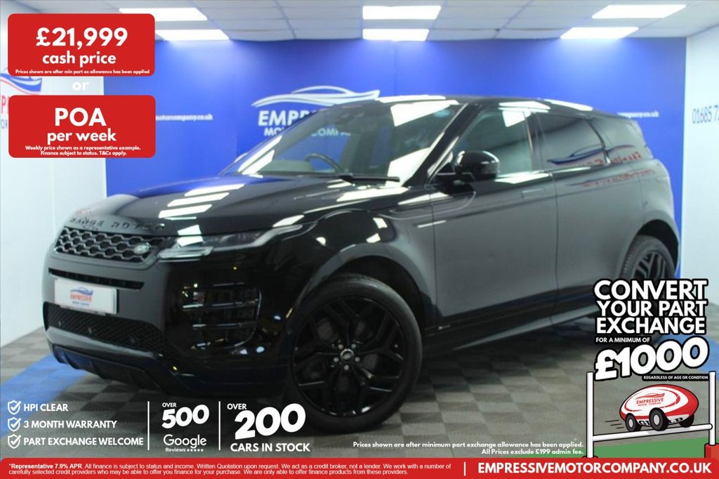 Merthyr TydfilInsurance Group 32, 0 Previous Owners, ****EXCELLENT EVOQUE**** Just in! This Stunning 2019 LAND ROVER RANGE ROVER EVOQUE 2.0 P200 MHEV RDynamic SE SUV 5dr Petrol Auto 4WD Euro 6 (s/s) (200 ps) Finished In Black! 38,880 Miles 2.0L Petrol Automatic Paddle Shifters 4X4 R Dynamic Electric Powered Tailgate 20" Gloss Black Wheels Reversing Camera Parking Sensors Sunroof Electric Powered Folding Mirrors Keyless Start USB Charging Ports Meridian Sound System Full Leather Seats Drivers and Passengers Memory Seats Electric Powered Seats Automatic Dual Zone Climate Control Heated Seats Heated Windscreen Auto Terrain Response Eco Mode Comfort Mode Grass Gravel Snow Mode Mud Ruts Mode Sand Mode Stop Start ATPC Bluetooth with Apple CarPlay Satnav Electric Handbrake LED Headlights Automatic Window Wipers Voice Assistant Speed Limiter Lane Assist .14way Heated Electric Memory Front Seats, 20in Alloy Wheels 5 SplitSpoke Style 5079 Gloss Sparkle Silver, 360 Degree Parking Aid, 402040 Split Fold Rear Seat, ABS Anti Lock Braking System, Airbags Driver Knee, Airbags Front Driver and Front Passenger, All Season Tyres, Ambient Interior Lighting, Android Auto, Apple CarPlay, ATPC All Terrain Progress Control, AutoDimming Interior Rear View Mirror, AutoDimming Power Fold Heated Door Mirrors with Memory and Approach Lights, Automatic Headlight Levelling, Automatic Headlights, Autonomous Emergency Braking, Black Gearshift Paddles, Bluetooth Connectivity, Body Coloured Roof, Brake Pad Wear Indicator, Bright Metal Pedals, Carpet Mats, Chrome Treadplates, Clear Exit Monitor, Cruise Control and Speed Limiter, Customer Configurable Autolock, DAB Digital Audio Broadcast, Driver Condition Monitor, DSC Dynamic Stability Control, EBA Emergency Brake Assist, EBD Electronic BrakeForce Distribution, Efficient Driveline, Electric Parking Brake, Electric Windows with OneTouch OpenClose and AntiTrap, EPAS Electronic Power Assisted Steering, ETC Electronic Traction Control, Evoque and RDynamic Badge, Flush Deployable Door Handles, Front and Rear Animated Directional Indicators, HDC Hill Descent Control, Headlights Automatic High Beam Assist, Headlining Ebony Morzine, Heated Rear Window with Timer, Hill Launch Assist, InControl Remote App, InControl Apps, Interactive Driver Display, Intrusion Sensor, Lane Keep Assist, Large Fuel Tank 65L, Leather Steering Wheel, Locking Wheel Nuts, Low Traction Launch, Manually Adjustable Steering Column, Navigation Pro, Overhead Lighting Console, Overhead Stowage for Sunglasses, P200 Badge, Park Assist, Passive Front Headrests, Passive Suspension, Power Operated Child Locks, Power Socket Pack 1, Powered Tailgate, Premium LED Headlights with Signature DRL, Pro Services and WiFi Hotspot, Push Button Start, RDynamic Exterior Pack, Rain Sensing Windscreen Wipers, Rear Air Vents, Rear Fog Lights, Rear ISOFIX, Rear Traffic Monitor, Rear View Camera, RSC Roll Stability Control, SE Badge, Seat Belt Reminder, Seats Rear Centre Head Restraint, Shadow Atlas RANGE ROVER Bonnet and Tailgate Script, Side Curtain Airbags and Thorax, Smart Settings, Sound System, Standard Roof, Sun Visors Illuminated Vanity Mirrors, Tailgate Spoiler, Terrain Response 2, Torque Vectoring, Touch Pro Duo, TPMS Tyre Pressure Monitoring System, Traffic Sign Recogn