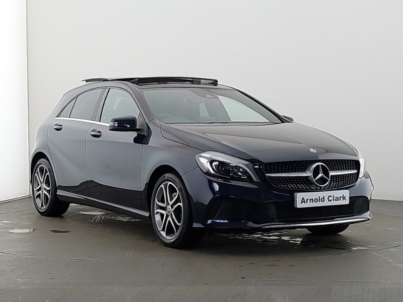 Stafford8" colour display screen, Bluetooth interface for hands free telephone, Collision prevention assist plus, DYNAMIC SELECT with a choice of driving modes (ECO, Comfort, Sport, Sport+ and Individual), Reversing camera, Smartphone integration with Apple CarPlay, Speed sensitive parameter assisted steering, Comfort suspension, Media interface, Mercedes Audio 20 radio/single CD + telephone keypad, Diamond radiator grille with black pins with one louvre in silver + chrome insert, LED daytime running lights, LED Headlights, Panoramic sliding sunroof, Privacy glass, Rain sensor windscreen wipers, Twin Trapezoidal tailpipes, Seat comfort pack A Class, Dual zone automatic climate control, Heated front seats, Isofix rear child seat preparation, 17" 5 twin spoke alloy wheels painted in black with high sheen finish