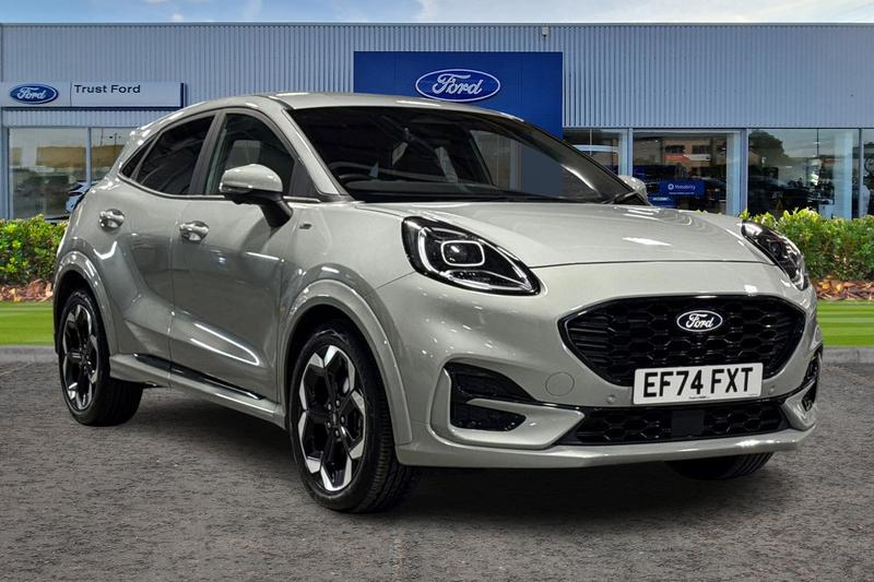 Insurance Group 12, Driver alert system, Emergency call service, Ford easy fuel, Full digital 12.8 instrument cluster, Lane keeping aid, Power assist steering, Power lift tailgate, Selectable drive modes(Normal, Eco, Sport, Slippery and Trail), Speed sign recognition, Wireless charger, Auto dimming interior rear view mirror, Automatic headlights with rain sensing wipers and auto high beam, Front fog lamps, LED daytime running lights, LED rear lamps, LED third brake light, Power foldable heated door mirrors with puddle lamps and puma logo protection, Quickclear heated windscreen, Rear privacy glass, Rear side wing doors, Rear wiper, STLine X body styling kit, 3 seat bench in 2nd row, Centre console with armrest and stowage, Electronic automatic temperature control (EATC), Ford megabox extended bootspace, Front and rear head restraints, Front floor mats, Manual 4 way driver seat adjust with lumbar adjustment, Manual 4 way passenger seat with lumbar support, Single front passenger seat, STLine X Premium synthetic leather upholstery, 3 rear seatbelts, Child safety lock, Electronic stability control (ESC) and hill start assist, Precollision assist with autonomous emergency braking, pedestrian/cyclist detection & postcollision braking, Tyre pressure monitoring system (TPMS)
