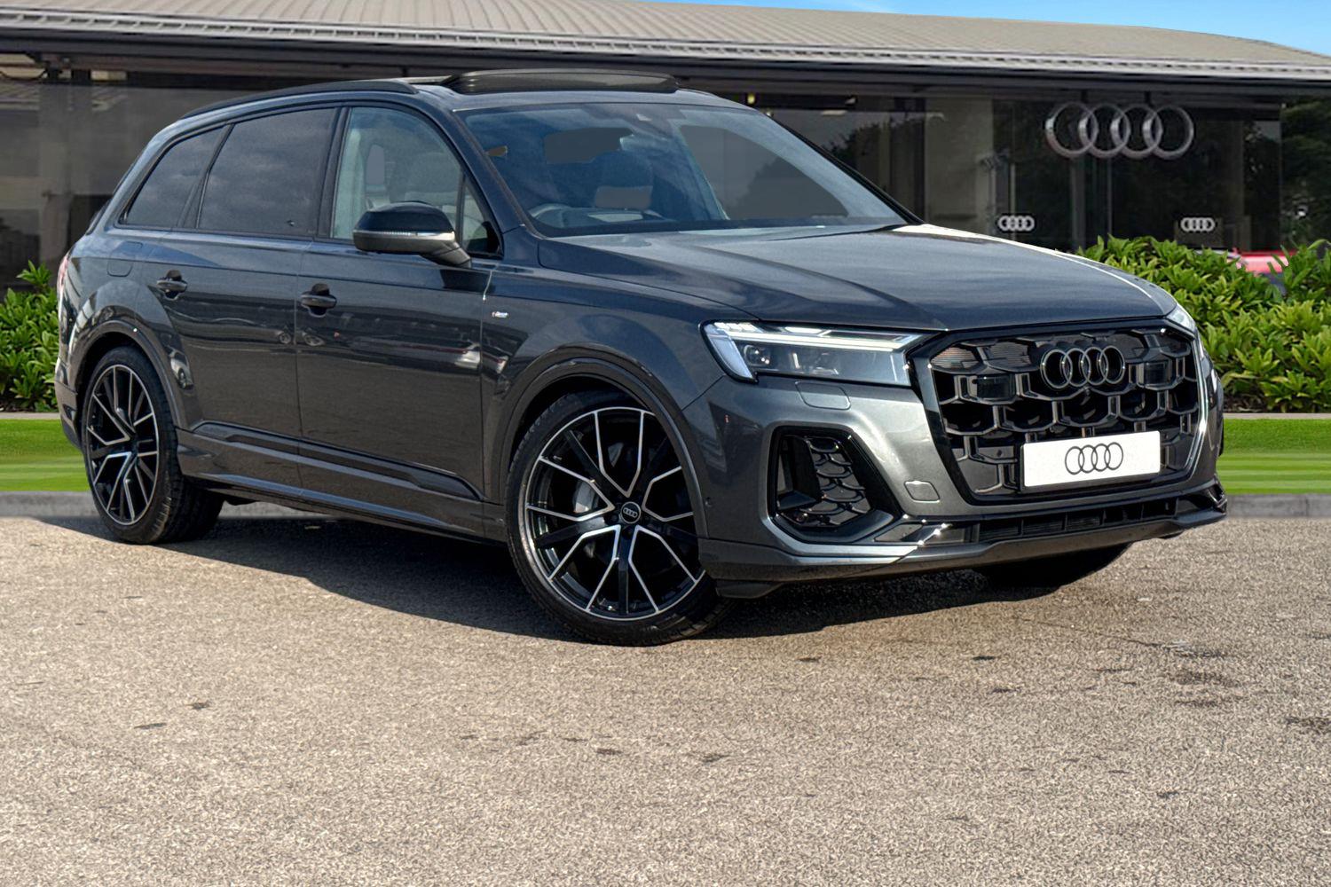 Price shown includes a deposit contribution of £5000 when purchased on finance by 31/03/26. Solutions Personal Contract Plan. 5.9% APR Representative. Audi Financial Services. Terms and Conditions apply. Feast your eyes on this BrandNew Audi Q7 SUV Black Edition TDI Quattro in Daytona Grey with its optional 22" 5Vspoke star design alloy wheels which look superb out on the roads. The Matrix LED headlights with LED rear lights plus, create that strong visibility in all weather conditions. This Q7 has some fantastic optional extras, such as the Technology package pro, which does include the panoramic glass sunroof which floods the cabin with light and is perfect for those sunny days. It also includes the branded premium sound system which creates that excellent sound experience for the driver and passengers to enjoy. Safety and convenience is further enhanced by the headup display which allows the driver to keep their eyes on the roads. The heated front and rear seats are perfect for those cooler mornings. Other brilliant features include the LED interior ambient lighting which enhances the cabins ambience and improves visibility of controls at night. The Audi phone box light with Bluetooth and wireless charging makes fully charging or just topping up our phones battery on any journey, a breeze. The multimedia interface allows the driver and front passenger to access a range of different media, such as Apple Carplay and Android Auto, allowing you to use apps like S...