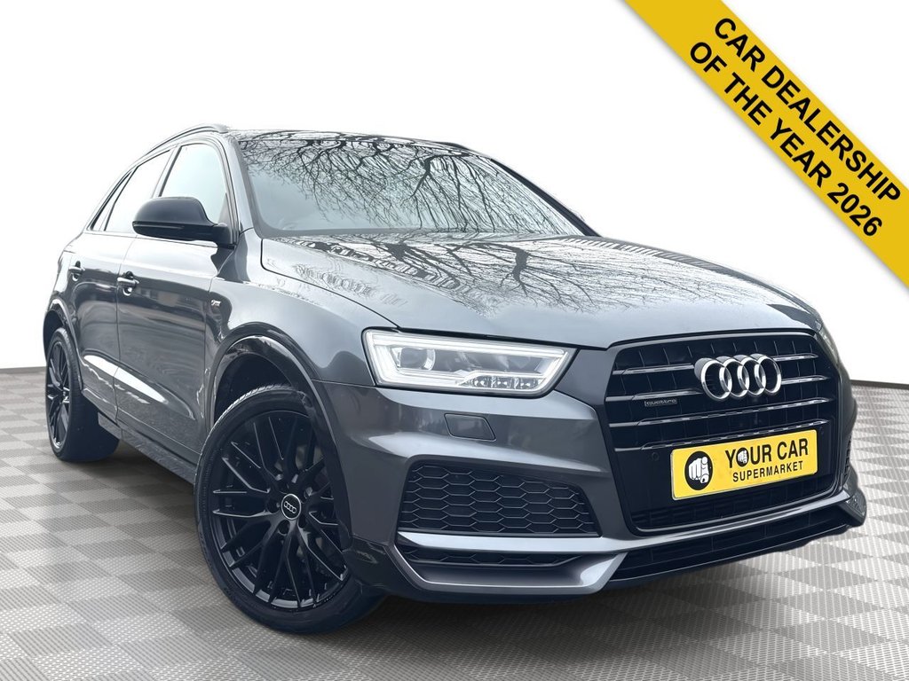 2 Previous Owners, This 2018 Audi Q3 TFSI Black Edition boasts a clear vehicle history, offering you peace of mind. This stylish SUV features a powerful 2.0 litre petrol engine paired with a four wheel drive system, ensuring confident handling in various conditions. As a Euro 6 compliant vehicle, it meets modern emissions standards. The Black Edition trim enhances its already striking appearance, while the interior is equipped with a Bluetooth interface for seamless connectivity, and a light and rain sensor that automatically adjusts headlights. Parking is made easier with the Audi Parking System Plus, featuring sensors at both the front and rear. Experience superior audio with the BOSE Surround Sound System, and enjoy personalised comfort thanks to the Dual Zone Electronic Climate Control. This Q3 TFSI Black Edition truly stands out with its impressive performance, accelerating from 0 to 60 miles per hour in just 7.6 seconds. This swift acceleration demonstrates its dynamic capabilities, setting it apart from other vehicles in its class and providing an engaging driving experience. BUY & DRIVE AWAY WITH CONFIDENCE AS ALL CARS FEATURE A 1 MONTH ENGINE AND GEARBOX WARRANTY AS STANDARD. AN ADDITIONAL 5 STAR, PREMIUM WARRANTY COVER PACKAGE IS AVAILABLE, RANGING FROM 3 MONTHS 3 YEARS FROM AS LITTLE AS £199. PLEASE GET IN TOUCH WITH A MEMBER OF STAFF FOR FURTHER ENQUIRES AND DETAILS. FIRST TO SEE WILL BUY ** BARGAIN****ANY INSPECTION WELCOME** **NO EXPENSE SPARED, KEPT TO A VERY HIGH STANDARD THROUGHOUT ITS LIFE**. A REAL TRIBUTE TO ITS PREVIOUS OWNER, LOOKS AND DRIVES EXCEPTIONAL. **IMMACULATE CONDITION THROUGHOUT**, MUST BE SEEN FOR THE PRICE. BARGAIN BE QUICK. ALL CARS COME WITH 250 & VAT ADMIN FEE AWARD WINNING CAR SUPERMARKET FOR 3 CONSECUTIVE YEARS. ONE OF THE ONLY CAR DEALERS THAT ARE TRADING STANDARDS APPROVED IN THE WEST MIDLANDS.... .19in Alloy Wheels 10YSpoke Design Diamond Cut Finish, 4Way Electric Lumbar Support for Front Seats, 6.5in Colour Display Screen, AMI Audi Music Interface, Anti Theft Locking Wheel Bolts, AntiTheft Alarm, Audi Drive Select, Audi Parking System Plus, AutoDimming RearView Mirror, BOSE Surround Sound System, Black Roof Rails, Black Styling Pack with Black Roof Rails, Bluetooth Interface, ChromePlated Trims for Exhaust Tailpipes, Cloth Headlining in Black, Concert Radio, Cruise Control, DAB Digital Radio, Door Mirrors HeatedElectrically AdjustableFolding, Driver Front Passenger Front Side and Head Airbag System, Drivers Information System DIS 3.5in Monochrome Display, DualZone Electronic Climate Control, ESC Electronic Stabilisation Control inc ABS ASR and EDL, Electric Windows Front, Electromechanical Parking Brake, Electromechanical Power Steering SpeedSensitive Provides a Precise Steering Feel at High Speeds and Excellent Assistance when Parking., Extendable Luggage Compartment Cover, First Aid Kit and Warning Triangle, FlatBottomed 3Spoke Perforated LeatherTrimmed Multifunction Steering WheelContrast Stitching with Paddles, Front Centre Armrest, Front Lip and Rear Diffuser in Full Paint Finish Diffuser Insert Painted Platinum Grey, Front and Rear Floor Mats, Front and Rear Fog Lights, Full Bodycolour Paint Finish with Front and Rear Bumpers Wheel Arch Trims and Lower Door Trims in Gloss Black, Gear Knob Perforated Leather, Gloss Black Door Mirrors, Gloss Black Rear Spoiler, ISOFIX Child Seat Mounting and Top Tether, Inlays Piano Finish Black, LED Headlights with LED Rear Lights and Dynamic Rear Indicators, LED Interior Light Package, Light and Rain Sensor, Manual Seat Adjustment, Pedals in Stainless Steel, Power Operated Tailgate, Privacy Glass, Remote Central Locking, Reversible Luggage Compartment Floor, S Line Badges on Front Wings, S Line Sports Suspension, Satellite Navigation System SD Card Based, Seat Belt Monitoring, Secondary Collision Brake Assist, Space Saver Spare Wheel, SplitFolding Rear Seats, Stainless Steel Loading Sill Protector, Steering Wheel Height and Reach Adjustable, Tool Kit and Car Jack, Towbar Preparation, Tyre Pressure Loss Indicator, Voice Control System, Windscreen with Acoustic Glazing