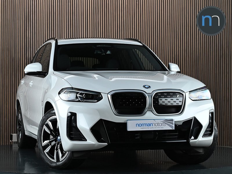 BournemouthInsurance Group 44, 1 Previous Owner, Norman Motors are proud to introduce this smooth riding BMW iX3 80kWh M Sport SUV 5dr Electric which is equipped with Reversing Assist Camera & Heated Steering Wheel. Two owners from new. Presented here in Mineral White with Black Vernasca Leather Upholstery. Upgrades and features include: 19" Aerodynamic Jet Black Alloy Wheels, Panoramic Glass Sunroof, Reversing Assist Camera, Parking Assistant, Apple CarPlay, Android Auto, Heated Seats for Driver and Front Passenger, Heated Steering Wheel, Electric Memory Seats, Front and Rear Parking Sensors, Enhanced Bluetooth with Wireless Charging, Driving Assistant Professional, Active Lane Changes, Traffic Light Recognition, BMW Live Cockpit Professional, M Sport Package, Flexible Charger, Sun Protection Glass, M Sport Leather Steering Wheel, Electrically Folding with Anti Dazzle Exterior Mirrors, Adaptive LED Headlights, LED Rear Lights, Ambient Lighting, Widescreen Display, Smartphone Integration, Stereo Speaker System.If you have any questions regarding history, condition, or specification of this vehicle, please get in touch with a member of the sales team..Flexible Charger,Mineral White,Model Specific Design Elements,Vernasca Leather Black with Blue Contrast Stitching, BMW Connected Package Professional, BMW ConnectedDrive Online Services, BMW Legal Emergency Call, BMW Live Cockpit Professional, BMW TeleServices, DAB Digital Radio, Enhanced Bluetooth with Wireless Charging, Power Sockets, Smartphone Integration, Stereo Speaker System, Widescreen Display, WiFi Hotspot, Attentiveness Assistant, BMW iDrive, Brake Pad Wear Indicator, Condition Based Service, Cruise Control with Braking Function, Driving Experience Switch, Front and Rear Parking Sensors, Parking Assistant, Reversing Assist Camera, TPMS Tyre Pressure Monitoring System, 19in Alloy Wheels Aerodynamic Jet Black with BiColour Inserts, Air Breather with BMW M logo, Blue Ring Around BMW Logos, Electric Windows Front, Exterior Mirrors Electrically Folding with Anti Dazzle, Exterior Trim HighGloss Shadowline, Front Bumper M Sport with iX3 Specific Design with Blue Contents, Heat Protection Sun Protection Glazing, M Aerodynamic Exterior, M Badging on Front Side Left and Right, M Sport Package, Panoramic Glass Sunroof, Rear Diffuser in Blue, Roof Rails Shadow Line High Gloss Black, Sun Protection Glass, Tyre Repair Kit, Washer Jets Heated, Welcome Lighting, Adaptive LED Headlights, Follow Me Home Headlight Function, Headlights Beam Throw Control, HighBeam Assistant, LED Rear Lights, Third Brake Light Using LED Technology, Air Conditioning Automatic, Ambient Lighting, Armrests, Automatic Operation of Tailgate, Automatic StartStop Button, Backrest Width Adjustment for Driver, Centre Lock Switch, Cup Holders Front x2, Door Sill Strips, Electric Memory Seats, Extended Storage, Floor Mats Velour, Galvanic Embellisher for Controls, Glove Compartment Lockable, Headlining M Anthracite, Heated Seats for Driver and Front Passenger, Heated Steering Wheel, Instrument Panel in Sensatec, Interior Lighting, Interior RearView Mirror with Automatic AntiDazzle Function, Interior Trim HighGloss Black with Pearl Chrome, Lashing Eyes in Luggage Compartment, Luggage Compartment Lights, Luggage Net, M Sport Leather Steering Wheel, Non Smoker Package, Rain Sensor with Automatic Headlight Activation, Rear Centre Armrest including Two Cupholders, Seat Backrest Adjustment for Rear Seats, Seats Front Sports, Split Folding Rear Seat, Steering Column Adjustment, Storage Options, Sun Visors with Vanity Mirrors and Ticket Holder, Adaptive Suspension, Charging Cable Mode 3 5m, DoubleJointed SpringStrut Front Axle, MultipleControlArm Rear Axle, Power Steering Electric, Preparation for Adaptive M Suspension, Servotronic Steering, Speed Limiter, ABS Anti Lock Braking System, Active Guard Plus, Active Protection, Airbags Driver and Front Passenger, Airbags Front Side for Driver and Passenger, Airbags Head Front and Rear, Alarm System, Bumper System Front and Rear Replaceable Deformation Elements for Impacts Up to 15kmh, CBC Cornering Brake Control, Closing System with Central Locking, Crash Sensor, Driving Assistant Professional, DSC Dynamic Stability Control Plus, DTC Dynamic Traction Control, Dynamic Brake Lights, eDrive Exterior Sound, Electro Mechanical Parking Brake, Electronic Vehicle Immobiliser, Reversing Light, Safety Battery Terminal Clamp, Side Impact Protection, Warning Triangle