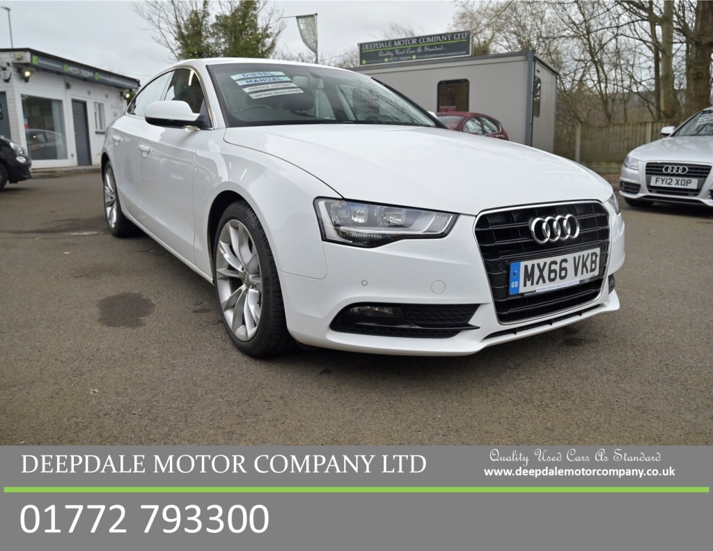 PrestonInsurance Group 31, 0 Previous Owners, FULL SERVICE HISTORY, 50000 miles. HERE WE HAVE A STUNNING AUDI A5 SE TECHNIK SPORTBACK FINISHED IN GLACIER WHITE WITH BLACK LEATHER UPHOLSTERY. THE STANDARD SPECIFICATION IS IMPRESSIVE, INCLUDING FRONT AND REAR PARKING SENSORS, HEATED SEATS, SAT NAV, AND MUCH MORE. AUDI'S SMOOTH 2.0 DIESEL ENGINE COUPLED WITH THE 6SPEED MANUAL GEARBOX PRODUCES FANTASTIC PERFORMANCE, SMOOTH DRIVE, AND RETURNS GREAT MPG. A STUNNING A5 DIESEL WITH A FULL SERVICE HISTORY AND ONLY ONE OWNER FROM NEW. RECENTLY SERVICED AND LONG MOT WITH NO ADVISORIES. FULLY HPI CHECKED AND CLEAR. WE OFFER FULL DEALER FACILITIES INCLUDING PART EXCHANGE, FINANCE AT COMPETITIVE RATES, INDEPENDENT WORKSHOP, AND EXTENDED WARRANTIES ARE AVAILABLE. ENJOY THE PROTECTION OF PURCHASING FROM A MOTOR DEALERSHIP ESTABLISHED IN 1994. Audi Parking System Plus Front Audi Parking System Plus Rear Heated Front Seats Cruise Control MMI Navigation Plus 18in Alloy Wheels 10Spoke Exclusive Design 12V Power Socket Centre Console ABS AntiLock Braking System AMI Audi Music Interface Airbags Driver Airbags Front Passenger Airbags Front Side Airbags Head Level Side For Front and Rear Alarm Thatcham Category 1 Anti Theft Locking Wheel Bolts Audi Sound System Auto Opening Boot Lid AutoDimming RearView Mirror Automatic Wipers with Rain Sensor Car Jack Climate Control Electronic 3Zone Colour Drivers Information System DIS Concert Radio Cup Holders Centre Console DAB Digital Radio Daytime Running Lights Display Screen Colour 7in High Resolution Door Mirrors Electrically Adjustable and Heated EDL Electronic Differential Lock ESP Electronic Stability Programme Electric Windows Front and Rear Electromechanical Parking Brake Electromechanical Power Steering Exterior Aluminium Package First Aid Kit Front Centre Armrest Front Fog Lights Front Passenger Airbag Deactivation Switch Front and Rear Floor Mats Halogen Headlights Headlights Light Sensor Headlights Range Adjustment ISOFIX Child Seat Mounting for Front Passenger ISOFIX Child Seat Preparation for Rear Seats with Top Tether Immobiliser Inlays Aluminium Trigon Intelligent Key Interior Chrome Package Manual Front Seat Adjustment Mobile Telephone Preparation Bluetooth Interface Pollen Filter Radiator Grille High Gloss Black Remote Boot Release Rest Recommendation System Space Saver Spare Wheel Speakers x10 Split Folding Rear Seat Steering Column Rake and Reach Adjustment Steering Wheel 3Spoke Leather Steering Wheel Multifunction Tool Kit