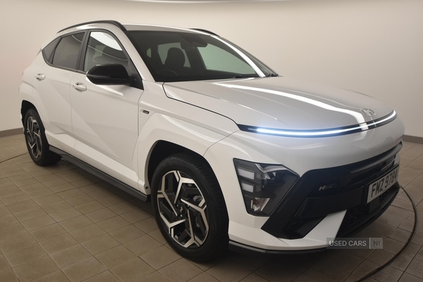 LisburnInsurance Group 16, 0 Previous Owners, This Hyundai KONA 1.6 Hybrid 129 N Line offers practical versatility and broad appeal, making it well suited for a wide range of motoring needs. With 23,215 miles recorded, it provides a reassuring balance between usage and ongoing value. The automatic transmission delivers a relaxed and confident driving experience, further complemented by a spacious boot, which expands from 466 to 1,300 litres as required for luggage or daytoday items.Finished in white, the vehicle features body colour door handles, gloss black door mirrors, and body coloured wheel arch inserts, all contributing to a cohesive and contemporary appearance. Full LED MFR headlights, LED daytime running lights, and a rear roof spoiler with integrated LED brake light lend both style and enhanced visibility. Privacy glass for the rear windows and tailgate, together with roof rails and tinted glass throughout, completes the smart exterior profile.Inside, the cabin presents N Line cloth upholstery, ambient lighting, aluminium pedals, and metal paint effect interior door handles, creating a comfortable and refined environment. The heated front and rear seats, heated steering wheel, and dualzone climate control ensure yearround comfort, while adjustable head restraints and a height/reach adjustable steering column offer tailored support. The 40/20/40 split folding rear seat, rear centre armrest with cupholders, and practical storage options add to the adaptability of the interior layout.Key specification highlights include a 12.3inch touchscreen centre console with satellite navigation, Bluetooth connectivity, and wireless smartphone integration for both Apple CarPlay and Android Auto. Advanced safety and convenience features comprise Smart Cruise Control with stop and go, Highway Drive Assist, Lane Keep and Follow Assist, a rear parking camera, front and rear parking sensors, Forward Collision Avoidance Assist, and a comprehensive airbag system. Added amenities such as wireless phone charging, a smart key with keyless entry, and a power tailgate further enhance daily usability
