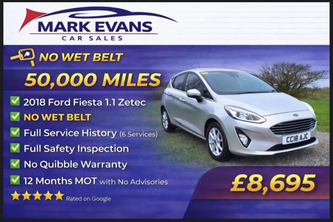 St AgnesInsurance Group 5, FORD FIESTA 1.1 ZETEC. This superb example has covered only 50,000 MILES from new and comes with FULL SERVICE HISTORY and just ONE FORMER KEEPER. Crucially, this model is fitted with the super reliable 1.1 petrol engine and is not the EcoBoost version, meaning there is NO WET BELT SYSTEM to worry about and longterm reliability is significantly improved. Registered on 20 August 2018, this Fiesta is presented in pristine condition throughout with an exceptionally clean interior and unmarked bodywork. It drives beautifully, offering comfort, practicality and excellent running costs, making it an ideal choice for everyday use. All of our cars come with a new advisory free MOT and a three month parts and labour warranty included in the price, providing peace of mind and hassle free motoring. This is a fantastic low mileage example that represents outstanding value and is ready to drive away..... We specialise in low mileage vehicles. Mark Evans Car Sales is based in St Agnes Cornwall TR5 0PA. We pride ourselves on giving fivestar service please take a moment to check out our fivestar reviews on Google, we are very proud of them. The Evans family has been in the motor trade in Cornwall for over 50 years. We take immense pride in our honesty, integrity, and openness. We work exceptionally hard to source the very best highquality vehicles available.