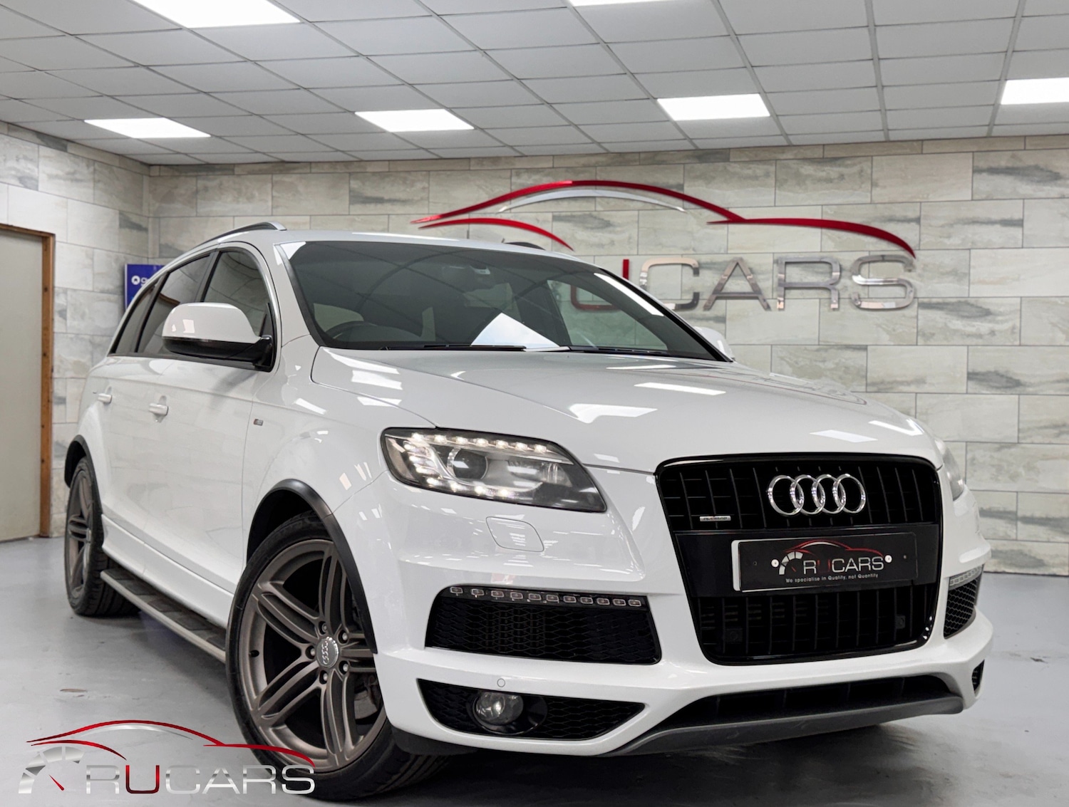 LoughboroughInsurance Group 41, Fantastic example Q7 which has clearly been well cared for & maintained! This 2013 '62' Audi Q7 SLine + 3.0 Tdi Quattro is finished in Glacier White with Black Verano Leather interior. SPECIFICATION Factory fitted unused tow bar Black pack BOSE Main beam assist Navigation/MMi Bluetooth Reverse Camera Electric memory Seats Rear DVD player Heated seats parking sensors Climate Control Cruise control Folding Mirrors Side steps 21'' Segment Alloy Wheels & much more! MAINTENANCE The car has a comprehensive service history with 8 documented services (Serviced 13k,23k,30k,46k,61k,64k,70k,75k) MORE ABOUT THE CAR The car is lovely throughout. The spec is fantastic, and the overall condition is excellent & of course it drives without fault. VIDEO https://youtu.be/de_WJKU94IU WHATS INCLUDED The car will come with a new MOT, fresh service and fully valeted. We have 2 keys, clear HPI report and all paperwork which includes an extensive service history FINANCE AVAILABLE 3 Months Warranty included with options to upgrade R U Cars Loughborough are a family run business established since 2013. Visit www.RUCARS.co.uk for more information Features Include: , 12v power socket centre console, 12v power socket luggage compartment, 12v power socket rear x2, 6.5in display screen, ami audi music interface, auxin socket, cd/radio, display screen colour 7in high resolution, fmam radio, hard drive 40gb, mmi radio plus with dsp sound system, mp3 and wma compatible cd player, mobile telephone preparation high with audi connect, sd card reader x2, sdhc card reader x2, satellite navigation system hdd based, single cddvd player, technology package high, 21in alloy wheels 5segmentspoke design, aluminium roof rails, anti theft locking wheel bolts, bumpers contrasting, collapsible spare wheel, door mirrors heatedelectrically adjustablefolding, electric windows front and rear, led indicators, privacy glass, rear door exit lights, s line badge on wings, s line badging, s line body styling, stainless steel running boards, window surrounds aluminium, 3d and topographical mapping, active door reflectors, advanced 3d building display, air vent sleeves aluminium look, ambient lighting centre console, audi exclusive piping, autodimming rearview mirror, automatic wipers with rain sensor, cables x2 mp3 connection including ipod, car jack, cloth headlining in black, comfort front centre armrest, cup holders