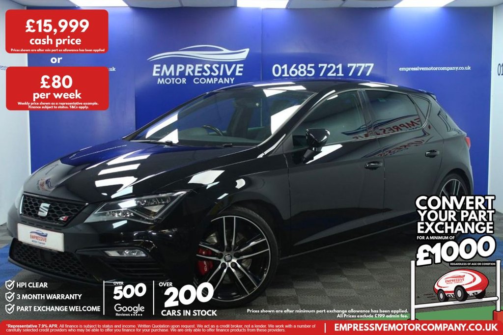 Insurance Group 33, 2 Previous Owners, ****STUNNING SEAT**** Just in! This Stunning 2018 SEAT LEON 2.0 TSI Cupra 300 Hatchback 5dr Petrol DSG Euro 6 (s/s) (300 ps) Finished In Black! 77,493 Miles 2.0L Petrol Automatic Paddle Shifters 19" Diamond Wheels Parking Sensors Electric Powered Folding Mirrors Stop Start Electric Handbrake Half Leather Cupra Seats USB Charging Ports Automatic Dual Zone Climate Control Comfort Mode Sport Mode Cupra Mode Individual Mode ESC Sport Bluetooth with Apple CarPlay Satnav Automatic LED Headlights Voice Assistant Digital Dash Front Assist Cruise Control Heated Mirrors.12V Power Supply in Centre Console, 19in Alloy Wheels CUPRA Machined, 7 Airbags, ABS AntiLock Braking System TCS Traction Control System, Active Front Head Restraints and 3 Rear Head Restraints, Black Interior Roof Lining, BodyColoured Door Handles, Boot Storage Net, Brake Callipers Red with Cupra Logo, Bumpers Exclusive Cupra Front and Rear, Cargo Rings in the Boot, Convenience Pack Plus, Cruise Control, CUPRA Performance Interface, Dark Tinted Rear Windows, DCC Dynamic Chassis Control, Digital Cockpit, Driver and Passenger Seat Height Adjustment, Driver and Passenger Sunvisor with Covered and Illuminated Mirrors, Drivers Seat Lumbar Adjustment, Dual Zone Climate Control, Electric Parking Brake Including Autohold Function, Electrically Folding Door Mirrors, ElectroMechanical Progressive Power Steering, ESC Electronic Stability Control and Tyre Pressure Warning Light Indicator, ESC SwitchOff Key, Flat BottomedPerforated Leather Steering Wheel with White Stitching and CUPRA Logo, Front and Rear Electric Windows, Front Assist with City Emergency Braking, Front Parking Sensors, Front Seat Back Storage Pockets, Front Sports Seats, Fuel Filler Flap linked to Central Locking, Full LED Headlights, Gearshift Indicator, Gloss Black Door Mirrors with Integrated LED Indicators, Gloss Black Interior Detailing, Head Restraints Height Adjustable Front, High Centre Console, High Gloss Black B and C Pillars, Hill Hold Control, Illuminated Aluminium Front Door Sill with CUPRA Logo, Instrument Lighting with Brightness Control, ISOFIX Points in Outer Rear Seats with Top Tether Anchorage Points, LED Front Fog Lights, LED Interior Illumination Pack, Lights Left On Warning Buzzer, Low Fuel Warning Light, Lower Suspension 15mm, Mechanical Limited Slip Differential, Media System Plus, Multi Coloured Ambient Lighting, MultiCollision Braking System, Navigation System, Outside Temperature Gauge, Pedals in Aluminium, Radiator Grille Frame in Glossy Black, Radiator Grille in Black, Rear Parking Sensors, Remote Central Locking with Deadlocks, RPM Counter, SEAT Drive Profile, SEAT Full Link Smartphone Integration Mirror Link Apple CarPlay Google Android Auto, Seatbelt Reminder Front, Seats Passenger Lumbar Adjustment, SpaceSaving Spare Wheel, Split Folding Rear Seats 6040 with Armrest, Steering WheelMounted Gearshift Paddles, Storage Box Under Driver and Front Passenger Seat, Trip Computer, Two Remote Keys with Window OpenClose Door Mirror Foldi