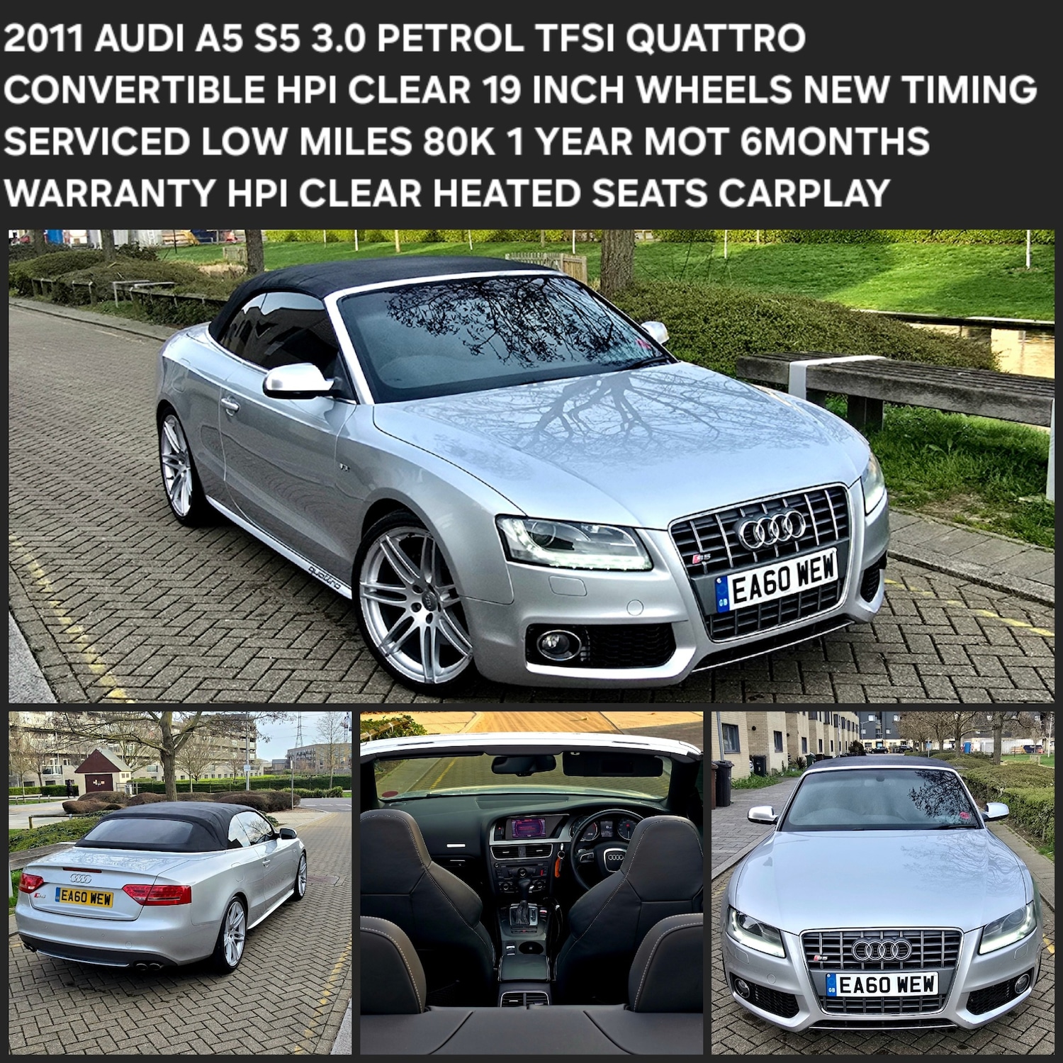 ErithAudi S5 Cabriolet 3.0 TFSI V6 Quattro Auto | CarPlay | Memory Seats | Heated Leather | 19 AlloysA beautiful example of the Audi S5 Cabriolet Quattro, finished in metallic silver with black softtop roof and full black leather sports interior. Powered by the impressive 3.0L V6 supercharged engine paired with Quattro allwheel drive and automatic gearbox, delivering strong performance with smooth and comfortable driving.The car is in excellent condition inside and out and drives superbly. It comes with a great specification including Apple CarPlay, electric memory seats, heated leather seats, Audi Drive Select, carbon fibre interior trim, MMI multimedia system, Bluetooth connectivity, cruise control, dualzone climate control, parking sensors, multifunction steering wheel and stylish 19 alloy wheels.The electric softtop roof works perfectly, making it ideal for enjoying opentop driving while still offering comfort and practicality.Maintenance & History Full Service History Two Keys Recently Serviced Timing work recently completed Fresh 12 Months MOT6 MONTHS FREE WARRANTY A fantastic combination of luxury, performance and convertible driving. The car drives excellent and must be seen to be appreciated.