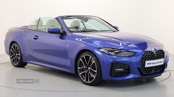 Coleraine1 Previous Owner, This 2023 BMW 4 Series 420i M Sport is a standout example, boasting exceptionally low mileage for its year. As a BMW manufacturer approved vehicle, it offers peace of mind, powered by a 2.0L Euro 6 petrol engine. This M Sport trim model comes equipped with the desirable M Sport Pro Package, enhancing its sporty appeal.Further enhancing your driving experience are the M Sport Brakes with striking red calipers, a testament to its performance credentials. Practicality is also a key consideration, with ample boot space designed to accommodate your needs. For added convenience and safety, this 4 Series includes the Parking Assistant, featuring front and rear sensors along with a rear camera. Additionally, the Wind Deflector and Warm Air Collar provide comfort for open top driving, making this a truly versatile and well appointed vehicle. EU6 RDE II exhaust emissions standard, Variable Sport Steering, Alarm System, Sensatec Dashboard, Aluminium Rhombicle Interior Trim, Ambient Lighting, Ext. mirrors folding with antidazzle, Rearview Mirror with Auto dimming, Driver Seat Backrest Width Adjustment, Extended storage, Heated front seats, Active Guard Plus, Front LED Foglights, Parking Assistant, Automatic Air Conditioning, Cruise Control, BMW TeleServices, BMW Emergency Call, BMW Online Services, Connected Package Pro (limited duration), DAB Radio, M Sport Suspension, M Sport Exterior Styling, Highgloss Shadowline Exterior Trim, Active Pedestrian Safety, OAAS Prep Highbeam Assist, M Sport Package, Deletion of Adaptive Suspension, 19'' 797 M Doublespoke Bicolour Jet Blac, Sport Automatic Transmission with Gearsh, Heated Steering Wheel, BMW Individual Lights Shadow Line, M Sport Brakes with Red Calipers, Comfort Access, Wind Deflector, M Sport Seat Belts, Warm Air Collar, Storage for wireless charging, Live Cockpit Pro with Head up Display, Harman/Kardon Surround Sound Audio, Indv. highgloss shadowline extended, Comfort Pack, M Sport Pro Package, Technology Pack, M Sport Pro Pack. Blue 4 seats. BMW Approved Used Car