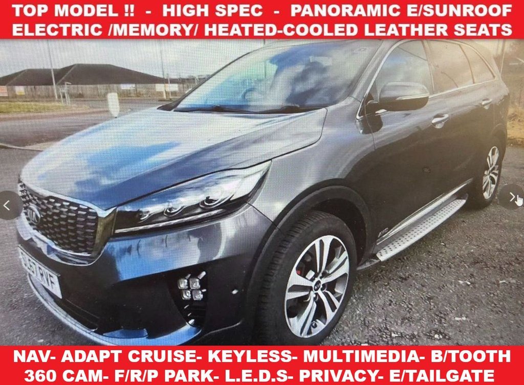 Bradford1 Previous Owner, TOP OF THE RANGE, HIGH SPECIFICATION 7 SEATER 4WD SUV + 2.2 CRDI TURBO DIESEL ( 197 PS ) + AUTOTIPPADDLESHIFT + ECOSPORTSMARTCOMFORT DRIVING MODES + 1 PREVIOUS KEEPER, LAST OWNER FOR 8 YEARS + DOCUMENTED KIA SERVICE HISTORY RECORD, 8 SERVICES PERFORMED, LAST SERVICED AT 104447 MILES ON 0512202 + COMES WITH 12 MONTHS MOT + DESIREABLE COLOUR COMBINATION OF WHITE PEARL PAINTWORK AND FULL BLACK / GREY LEATHER UPHOLSTERY COMPLIMENTED WITH GREY STITCH AND WHITE PIPING + GT LINE EMBOSSED ELECMEMHEATCOOL EXTENDABLE FRONT SPORT SEATS WITH E/LUMBAR AND EASY EXIT MEMORY + HEATED REAR SEATS + PIANO BLACK INTERIOR TRIM + ETILT/SLIDE PANORAMIC SUNROOF WITH E/SUNBLIND + XENON HEADLIGHTS WITH JET WASH AND LED DAYTIME RUNNING LIGHTS + STOPSTART + 360SURROUND VIEW / FRONT / REVERSE / SIDE CAMERAS + F/R/PARALLEL PARKIND AID + DIFFERENTIAL LOCK + HILL DESCENT CONTROL + TRACTION CONTROL + AUTO HOLD BRAKES + 19 INCH ALLOYS + SIDE STEPS + PRIVACY GLASS + SIDE WINDOW BLINDS + ROOF RAILS + ROOF SPOILER + KEYLESS ENTRYLOCKSTART + SATELLITE NAVIGATION + VOICE CONTROL + BLUETOOTH + WIRELESS SMARTPHONE CHARGER + DRIVING ASSIST + LANE ASSIST + BLIND SPOT + ADAPTIVE CRUISE CONTROL + HARMAN KARDON SOUND SYSTEM + DAB RADIO/ CDDVD PLAYER, AUXUSB CONNECTIVITY + MULTIZONE ZONE CLIMATE CONTROL AIR CON + HEATED MULTIFUNCTIONAL LEATHER STEERING WHEEL WITH PADDLESHIFT + POWER STEERING + REMOTE CENTRAL LOCKING + 4X E/WINDOWS + POWER FOLDING E/DOOR MIRRORS + AUTO LIGHTS, WIPERS, DIMMING REAR VIEW MIRROR + ALARMIMMOBILISER + 12V SOCKETS + ISOFIX + ETAILGATE (OPENCLOSE) +++ PART EXCHANGE WELCOME +++ 3, 6, 12 MONTHS WARRANTIES AVAILABLE +++ DELIVERY POSSIBLE NATIONWIDE (ASK FOR QUOTE) +++ WE ARE FCA APPROVED AND CAN ARRANGE IN HOUSE FINANCE +++ Every effort has been made to ensure the accuracy of the above vehicles information but errors may occur. Please check with a salesperson any details that are important to you and may influence your decision whether to buy or not, thank you.Leather Black with Grey Stitching, Graphite, 10Way Power Adjustable Drivers Seat with 4 Way Electric Lumbar Support and Integrated Memory System, 19in Alloy Wheels, 2nd Row Sunblinds, 3 x Passenger Assist Grips, 360 Degree Around View Monitor, 402040 Split Folding and Reclining 2nd Row Seats, 7in LCD Full Colour Display, 8Way Power Adjustable Passengers Seat Sliding Reclining Tilt Height with 2 Way Electric Lumbar, 8in Touchscreen Satellite Navigation with European Mapping and Traffic Messaging Channel TMC, ABS with Electronic Brakeforce Distribution EBD and Brake Assist System BAS, Adaptive Smart Cruise Control Function, Advanced Anti Theft Alarm System, AllRound 3Point Seatbelts, AllRound Electric Windows with Auto UpDown Function, AllRound Height Adjustable Headrests, Aluminium Door Scuff Plates with Front Illumination, Android Auto with Voice Control, Apple CarPlay with Voice Control, Armrest Rear Centre, Auto Dimming RearView Mirror, Automatic Headlight Control, Autonomous Emergency Braking AEB, Black Side Sill and Wheel Arch Body Mouldings, Blind Spot Detection, Bluetooth with Music Streaming, Body Coloured Bumpers, Body Coloured Door Mirrors, Centre Console Cupholders, Centre Console with Front Ambient Lighting, Child Safety Rear Door Locks, Cloth Wrapped A and B Pillars, Cloth Wrapped and Extendable Sunvisors with Vanity Mirrors Illumination and Ticket Holder, Cupholders in Rear Armrest, DABRDS Radio with MP3 Compatibility, DBC Downhill Brake Control, Dash Illumination Dimmer Switch Rheostat, Door Deadlocks, Door Handles Chrome, Drive Mode Select 4 Modes, Driver Attention Warning DAW, Dual Automatic Air Conditioning, ESC Electronic Stability Control, Electric Parking Brake with Auto Hold Function, Electrically FoldingAdjustable and Heated Door Mirrors with LED Indicator Lights, Emergency Stop Signalling ESS, Engine Immobiliser, Engine StartStop Button with Smart Entry System, Foot Lamp, Front 2 and Rear 1 2nd Row 12V Power Sockets, Front Cabin Map Light LED, Front Centre Console Armrest, Front Centre Console Storage Box, Front Door Courtesy Reflectors, Front Parking Sensors, Front Passenger Airbag Cut Off Switch, Front Seatback Pockets, Front Seatbelt Height Adjusters, Front Seatbelt PreTensioners and Load Limiters, Front Wiper DeIcer, Front and Rear Door Storage, Full Size Alloy Spare Wheel, GTLine Exterior Styling Pack, GTLine Interior Styling Pack, Glovebox Flocking, Glovebox with Illuminat