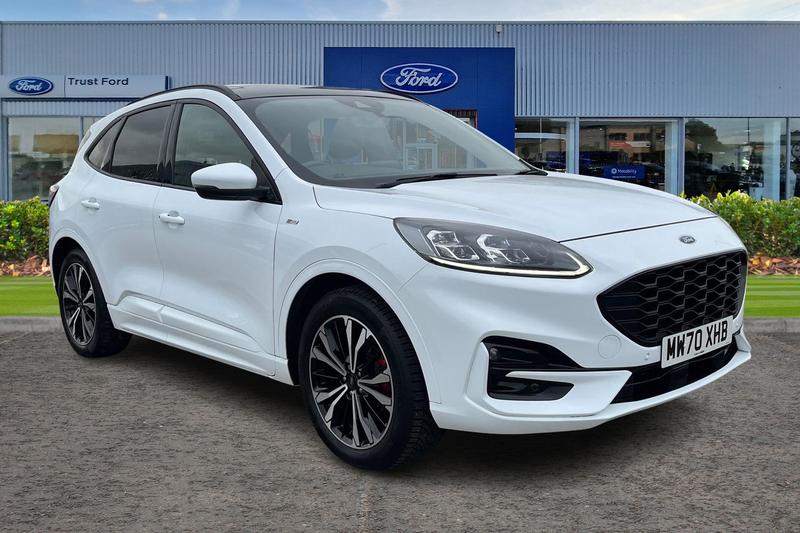 Insurance Group 14, 12.3 digital colour instrument cluster, Ford easy fuel, Ford SYNC 3 with 8 TFT LCD touchscreen, App Link, andriod auto/apple carPlay, emergency assistance and navigation with Ford pass connect, Front and rear parking sensors, Hands free power tailgate, Lane keeping aid with lane departure warning, Power assist steering, Rear view camera, Selectable drive modes, Service interval indicator, Auto headlamps with high and low beam, Black roof rails, Day/night rear view mirror, Front LED fog lamps, Large rear spoiler, LED daytime running lights, LED rear lights, Power folding heated door mirrors with puddle lights, Power front/rear windows with global close, Power opening panoramic roof, Privacy glass, Quickclear heated windscreen, ST Line body styling kit with unique front and rear fascia and bumper, rear painted diffuser, front painted skid plates, dark mesh upper grille, ST Line front scuff plates, Third brake light, Twin exhausts, 10 way power adjustable drivers seat, 2nd row sliding seats with 60:40 split, 8 way manual passenger seat including lumbar support and height adjust, Alloy pedals, Centre console with electronic parking brake, Dark headlining and pillars, Dual electronic automatic temperature control, Flat bottomed leather steering wheel in sensico with red stitching, Front and rear head restraints, Heated passenger and driver seats, Heated rear seats, Heated steering wheel, Partial premium touch sensico leather upholstery with black cloth inserts and red stitching,