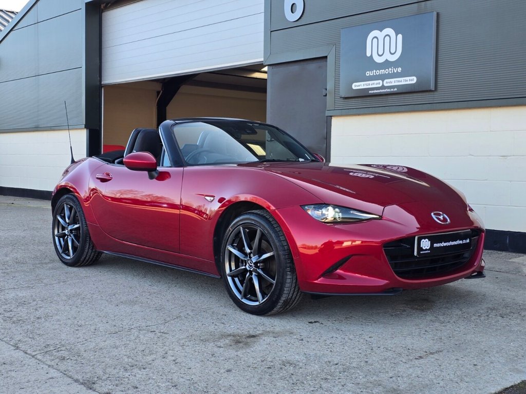 Aylesbury2 Previous Owners, We are delighted to offer this fantastic Specially Selected M&W used Mazda MX5 2.0L Petrol, Manual GSport Nav, 2 Door Convertible in metallic Soul Red. This brilliant used car comes with a FANTASTIC SERVICE HISTORY, and the services have been carried out by independent service centers and by main Mazda dealers, The vehicle has also received an independent multipoint inspection and New MOT valid until March 2027 and is supplied with 2 keys. This super used Mazda is superb to drive, it is everything you expect and hope for in an MX5 and it sounds fantastic with the Cobra Exhaust, this model fully maintains the cars iconic two seater sport car status and of course now becoming very desirable and collectable! The 2.0L engine is the best in the range, it provides the perfect amount of power for a car of its size and allows you to have loads of fun out on the roads, its light and agile, but still very comfortable, economical to run which makes it the perfect car for anywhere in the UK or even on a European ! The vehicle is packed with great tech too, this includes, Navigation, Bluetooth Music Streaming, DAB , AUX / USB Media Integration, Heated Front Seats, Sports Seats ,Multi Function Steering Wheel with Cruise Control, Auto Lights, Auto Rain Sensing Wipers, Electric Windows, Electric Mirrors.... Finance is available with ZERO DEPOSIT, you can apply directly within minutes via the finance tab on this page, or on our website, we can get a decision within the hour and you can drive away the same day! All our cars come with a three month guarantee as standard and we give you the option to upgrade to one of our Extended 624 month Warranty options should you wish, full details of our warranty cover can be found on our website mandwautomotive.co.uk .Welcome to M&W Automotive, Part Exchange Welcome, Free PX Valuations, Competitive Finance Options Available , Optional 1224 Month Extended Warranties, 17in Alloy Wheels Bright Finish, 7in Colour Touch Screen Display, Adjustable Speed Limiter, Aha App and Stitcher App Integration, Air Conditioning Climate Control, Air Conditioning Dials Chrome, Air Vent Surrounds Chrome, Analogue Speedometer, Audio Transfer from Bluetooth Devices, Auto Dimming Rear View Mirror, Automatic Passenger Airbag Deactivation System, Auxiliary AUX and Two USB Input, Body Coloured Door Mirrors, Chrome Meter Rings, Coinbox, Convertible Top Premium Cloth Soft Top with Heated Rear Window Manually Operated, Cruise Control with Manual Speed Adjustment, Cupholder Front x2, DHS Deployable Hood System, Double Pinion Electric Power Assisted Steering DPEPAS, Driver and Passenger Front Airbags, Dual Exhaust System, Dusk Sensing Automatic Headlights, Dynamic Stability Control DSC with Traction Control System TCS, Electric Windows One Touch Auto Down, Electrically AdjustableHeated Door Mirrors, Emergency Tyre Repair Kit, Engine StartStop Button, Fashion Bar Cladding, FourWheel AntiLock Braking System 4WABS with Electronic BrakeForce Distribution EBD, Fuel Filler Lid Body Colour, Gear Knob Leather with Chrome Surround, Gear Shift Indicator, Handbrake Leather Wrapped, Headlights Adaptive Front Lighting System, Headlights ComingLeaving Home, Headlights LED with Auto Headlight Levelling, Heated Seats, Hill Hold Assist, ISOFIX Child Seat Anchorage Passenger Seat, Inner Door Handles Chrome, Integrated Bluetooth, Interior Courtesy Light, Interior Upper Door Trim Body Coloured, LED Daytime Running Lights, LSD Limited Slip Differential, Lane Departure Warning System, Multimedia Commander, Multimedia System, RainSensing Front Wipers, Rear Brake Light High Mounted, Rear Parking Sensors, Remote Central Locking with Deadlocking and Remote Boot Release, SKYACTIVBody Engineered Triple H Body Structure to Help Protect Occupants from Impact Forces, SRS Supplementary Restraint System, Satellite Navigation System, Seatbelts 3 Point ELR 2x with PreTensioners, Seatbelts Reminder Screen with Audible Warning, Seats Drivers Manual SlideRecline and Tilt Adjustment, Seats Front Passenger Manual Slide and Recline Adjustment, Side Airbags, Side Door Trim Black with Red Stitching, Smart Keyless Entry, Sports Suspension, Steering Wheel