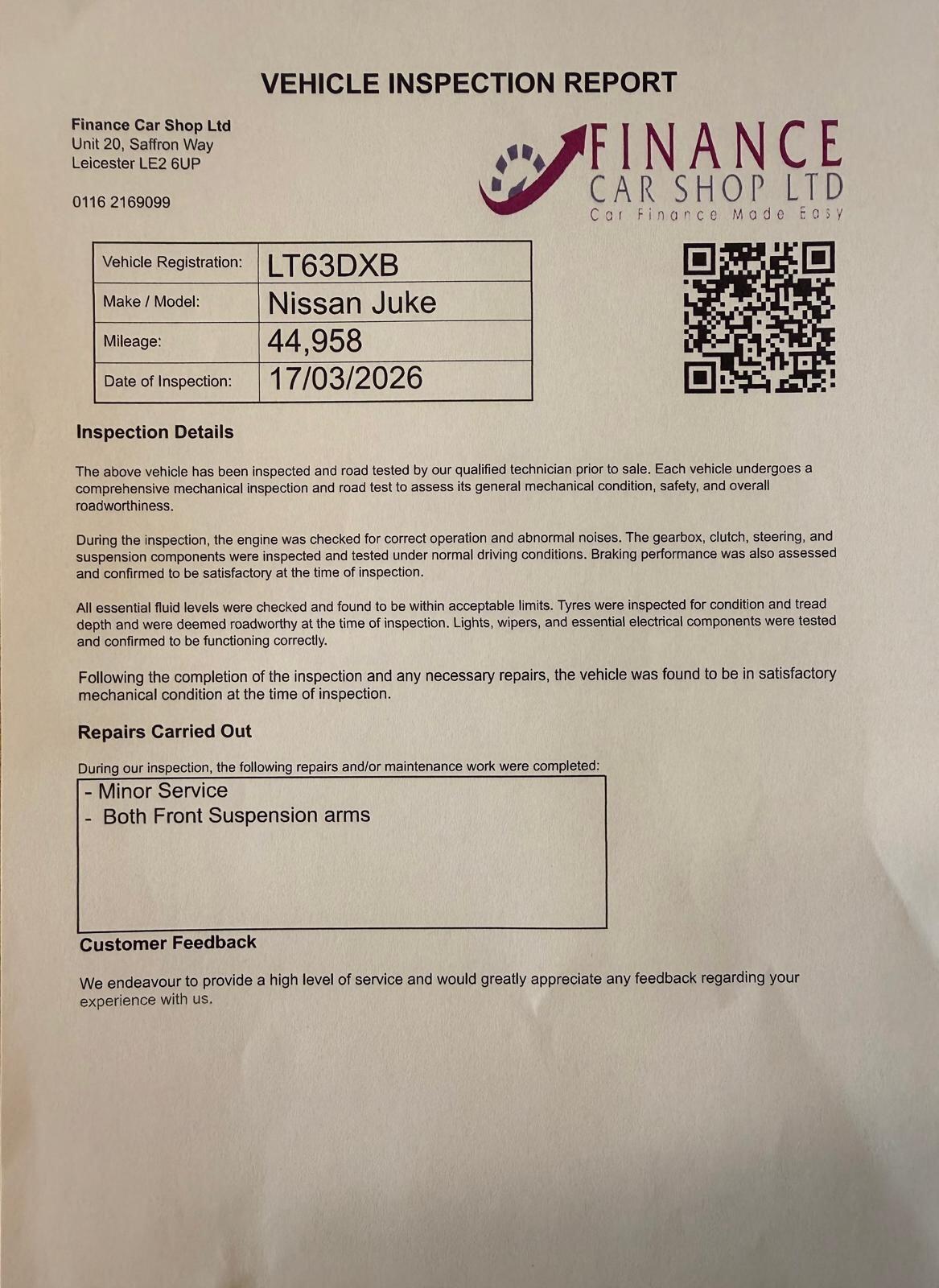 Leicester1 Previous Owner, SERVICE HISTORY, JUST SERVICED, SATELLITE NAVIGATION, REVERSE CAMERA, Stand out on the road with this Nissan Juke Acenta Premium, a compact SUV that combines bold styling, practicality, and modern technology. Comfortable to drive with a raised seating position, its perfect for city driving and longer journeys.Key Features1.6L petrol engine smooth and reliable performanceStop/Start (s/s) technology for improved fuel economy5door compact SUV with higher driving positionSatellite navigation systemReversing camera for easier parkingBluetooth connectivity for calls and musicDAB digital radio & USB connectivityCruise control with speed limiterClimate control air conditioningAlloy wheelsKeyless entry & pushbutton startWhy Choose the Juke?Stylish and distinctive designPractical interior with good boot spaceComfortable driving position with great visibilityReliable and economical to run Perfect ForCity driversSmall familiesFirsttime SUV+ 6 MONTHS WARRANTY INCLUDED + 6 MONTHS BREAKDOWN COVER + EXTENDED WARRANTY AVAILABLE + FINANCE OPTIONS AVAILABLE UPON REQUEST + DELIVERY CAN ONLY BE ARRANGED ONCE THE VEHICLE HAS BEEN VIEWED & INSPECTED IN PERSON AT OUR PREMISES + PHOTO ID IS REQUIRED FOR ALL VIEWINGS AND TEST DRIVES + WE CAN BE REACHED VIA WHATSAPP ON 07458 300017 FEEL FREE TO MESSAGE US + PLEASE NOTE, THE PRICE IS FIXED ON THIS VEHICLE. KINDLY BE AWARE OF THIS PRIOR TO ARRANGING A VIEWING + WE HAVE OVER 50 VEHICLES IN STOCK. AS NOT ALL VEHICLES ARE HELD ON SITE, PLEASE ENSURE YOU CALL IN ADVANCE BEFORE MAKING YOUR JOURNEY + BANK TRANSFER ONLY + MORE CARS AVAILABLE AT:WWW.FINANCECARSHOPLTD.CO.UK +