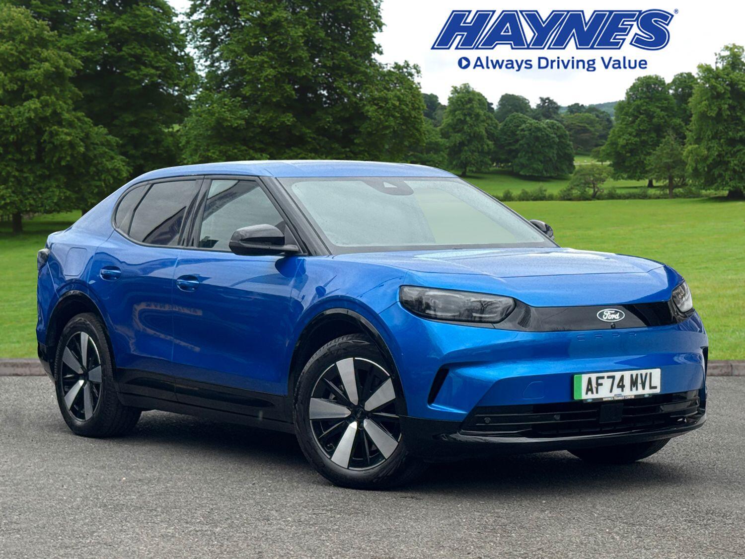 Maidstone1 Previous Owner, Franchise Approved, This 2024 Ford Capri Extended Range Select offers an exceptional electric driving experience with a remarkable maximum range of 389 miles. As an all electric vehicle, this Select trim model is equipped with an 82 kWh battery, providing ample power for your journeys. Charging at home on a 7kW charger will take approximately 11 hours and 21 minutes for a full charge, while rapid public charging can take you from empty to 80% in just 32 minutes. Inside, you'll find a host of premium features designed for comfort and convenience, including heated driver and passenger seats with a soothing massage function, and a 12 way power adjustable driver's seat with memory settings. The Driver Assistance Pack enhances safety and ease of use, incorporating a Head Up Display and a 360 degree camera for comprehensive parking assistance, complemented by a rear view camera. Intelligent Adaptive Cruise Control with Stop Go functionality further simplifies driving.The highlights of this Ford Capri Extended Range Select demonstrate its superior performance and capability compared to other vehicles in its class. Its impressive acceleration allows it to go from 0 to 62 miles per hour in a swift 6.4 seconds, offering an engaging driving dynamic. Furthermore, the substantial 389 mile maximum range at new means you can travel further on a single charge, reducing the need for frequent stops and providing greater peace of mind on longer trips.HAYNES APPROVED USED CAR. WE DO NOT CHARGE ANY ADMIN FEES. Comes with a minimum 12 Months Ford Warranty, Ford Approved Used Vehicle Inspection and Mileage History Check. PLEASE NOTE: The standard equipment listed details the usual specification of the most recent model of this vehicle. It is not the exact data for the actual vehicle being offered for sale and actual specification may vary slightly. Some of our used vehicles have been company cars and may have had multiple users. We recommend that you always view the car and check you are happy with the individual vehicle prior to purchase. CALL US TODAY TO ARRANGE A TEST DRIVE.