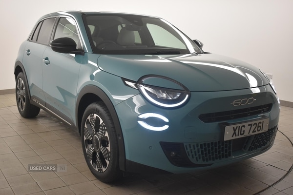 LisburnThe Fiat 600 1.2 Hybrid 48V 136 La Prima offers an inviting experience for a wide range of drivers, blending efficient petrol hybrid technology with the practicality of an automatic gearbox. With a low mileage of just 4,757 miles, this vehicle presents as a wellpreserved option, while the inclusion of features such as heated front seats, a poweradjustable driver seat with lumbar support and massage function, and automatic climate control contribute to a comfortable and convenient driving environment. The adjustable boot floor and Cargo flex fit system provide adaptable luggage solutions, making daily use seamless and flexible.Delivering a power output of 136 bhp, the Fiat 600 achieves a 060 mph time of 8.5 seconds and a top speed of 124 mph. These figures ensure responsive and assured performance for a variety of driving conditions, whether on the motorway or around town. Paddle shifts allow for a more engaging driving experience when desired, while the automatic transmission maintains ease of use.A distinctive blue paint finish is complemented by a suite of exterior styling enhancements, including bodycoloured door handles, chrome accents, and gloss black detailing on the B pillars and mirrors. The vehicle is further distinguished by its rear roof spoiler, chromed exhaust tip, and privacy glass, while LED lighting throughoutcovering signature, daytime running, and rear lightscreates a modern and cohesive appearance. Interior elements such as monogram synthetic leather upholstery, a dark metachrome dashboard ring, and velour floor mats add refinement to the cabin.Specification highlights include a 7'' TFT digital cluster, wireless smartphone connectivity including Apple CarPlay and Android Auto, and wireless charging for compatible devices. Driver assistance is comprehensive, featuring adaptive cruise control with lane centring, blind spot detection, semiautomatic parking, and a 360degree parking sensor system with a rear view camera. The vehicle prioritises safety with six airbags, ISOFIX attachments, Autonomous Emergency Brake with Vulnerable Road User protection, electronic stability control, child locks, and a volumetric alarm. Features such as handsfree power liftgate and keyless entry further enhance everyday convenience