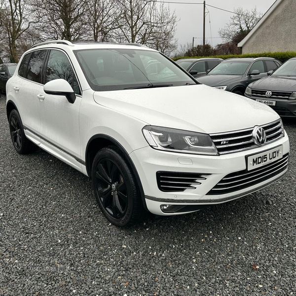 Dungannon1 Previous Owner, 2015 Volkswagen Touareg 3.0 V6 262bhp White Rline 4M Auto* 99k miles* Sunroof*262bhp Rline spec; panoramic sunroof, black heated leather, park assist, 20" black alloy wheels 99k fully warranted visa miles Mot December 2026 FSH Hpi clear 2 keys 2 keepers £315 tax Ins group 43EJeep drives great first to see will buy £13,650 Ono call or text 07521572554