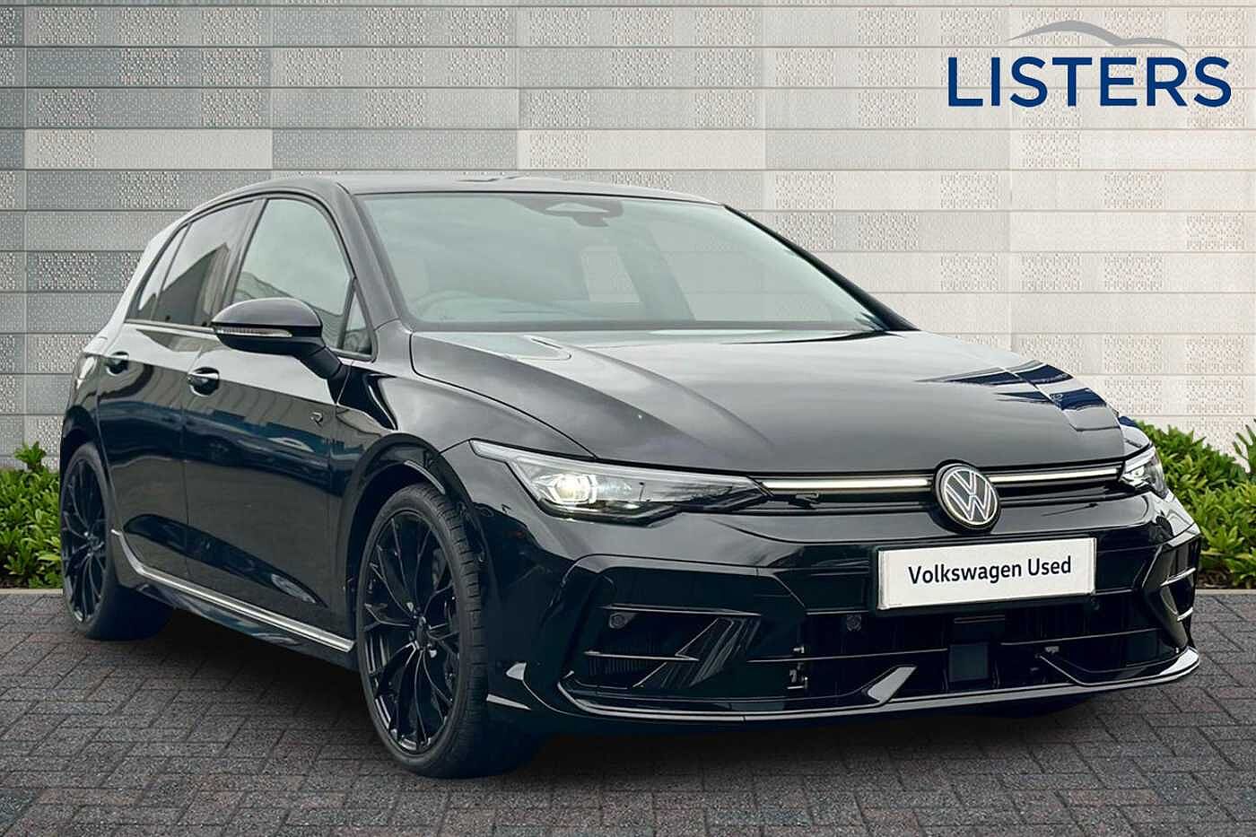 ExDemo, Insurance Group 34, 0 Previous Owners, Franchise Approved, Available from 08/04/2026. Volkswagen Golf Hatchback 2.0 TSI 333 R Black Edition 4Motion 5dr DSG in Grenadilla Black. Specification Includes Exterior Features,Metallic paint,Adaptive chassis control DCC driving profile selection front and rear shock absorpotion front disc brakes,Sports suspension,Safety,Front disc brakes,Rear view camera,Interior Features,Door insert side trim panel and arm support in leatherette,Leather wrapped multifunction sports heated steering wheel with touch control and paddle shift,Tilting and sliding panoramic sunroof with 2X front and 2X rear LED reading lights,Audio / Communications,6 Speakers 4 in front and 2 in rear with central speaker,Harman/Kardon sound system including 12 channel digital amplifier 480 watt output and 9 speakers plus subwoofer,Miscellaneous,Head up Display,Packs,Nappa leather upholstery pack Golf,Trim,Front seat lumbar support adjuster,Wheels,19in Warmenau black alloy wheels,Paint Metallic,Metallic Grenadilla black,Trim Leather,Nappa leather pack Blue/Soul black,Exterior Features,Front and rear electric windows,Heat insulating windshield made of laminated glass,Rain sensor,Rear tinted glass 65% light absorbing from B pillar backwards,Rear windscreen washer and wiper with interval delay,Black badge on Bpillar,Black strips on radiator grille and headlights,Body colour door handles,Darkened R Logos and VW logos in front rear and on fender,Illuminated lighting animation with wake up/goodbye scenario,R name plate,Rear side wing doors,3rd brake light,Automatic headlamp activation with Coming home and Leaving home feature,Darkened headlights,Front fog lamps and cornering light,LED matrix headlights with ambient light V2 advanced high beam dynamic range contol with cornering LED rear lamp with indicator poor weather,LED separate daytime running light,Light assist with High beam control,Rear fog light on one side and reversing lights on both sides,Welcome light with surround lighting,Safety,ABS,Autonomous emergency braking front assist with pedestrian and cyclist monitoring,Electronic parking brake with auto hold,ESC (Electronic Stability Control),Front and rear black brake calipers with darkened Rlogo,Hill start assist,Rear disc brakes,Volkswagen roadside assistance,Activated carbon canister,Adaptive cruise control (ACC),Advanced driver attention and drowsiness monitor,Dynamic road sign display,Electronic maximum speed limit increased to 270 km/h includes driving Modes 'drift' and