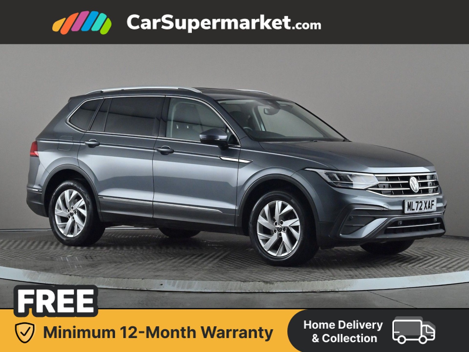 Insurance Group 19, 0 Previous Owners, Volkswagen Tiguan Allspace 1.5 TSI Life (7 Seats) (Grey) Large family SUV with seven seats, digital cockpit, AppConnect smartphone integration, adaptive cruise control and digital radio. Also features privacy glass and automatic climate control. Last serviced 9 March 2026, MOT due 2 December 2026. Minimum 12month warranty.