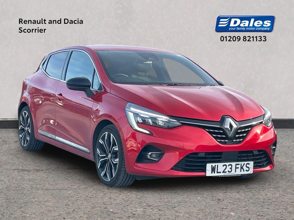 RedruthInsurance Group 18, 0 Previous Owners, The 2023 Renault Clio 1.6 Etech Full Hybrid 145 Techno Automatic Hatchback in Renault ID Flame red is a technologically advanced vehicle with numerous features. It has only covered 18000 miles and is in excellent condition. This hatchback boasts a sleek design with a chrome front grille, full LED front and rear headlamps with daytime running lights, and 17" Viva stella diamond cut alloy wheels with grey and black inserts.Inside, the Clio offers a comfortable and premium experience with 3D Fabric velvet upholstery, a 7" driver information display cluster, and automatic climate control. The car is packed with safety features such as ABS, lane departure warning system, and AEBS active emergency braking system. It also includes convenience features like cruise control, Apple CarPlay/Android Auto, and an Easy Link navigation system.The Renault Clio prioritises safety with features such as curtain airbags, ESC Electronic Stability Control, and an Emergency call system. Its practicality is enhanced by 60/40 split and fixed base rear seat bench, luggage nets in the boot, and a 6.2L front glovebox for storage. This car is perfect for those seeking a blend of style, efficiency, and safety in their everyday driving experience.