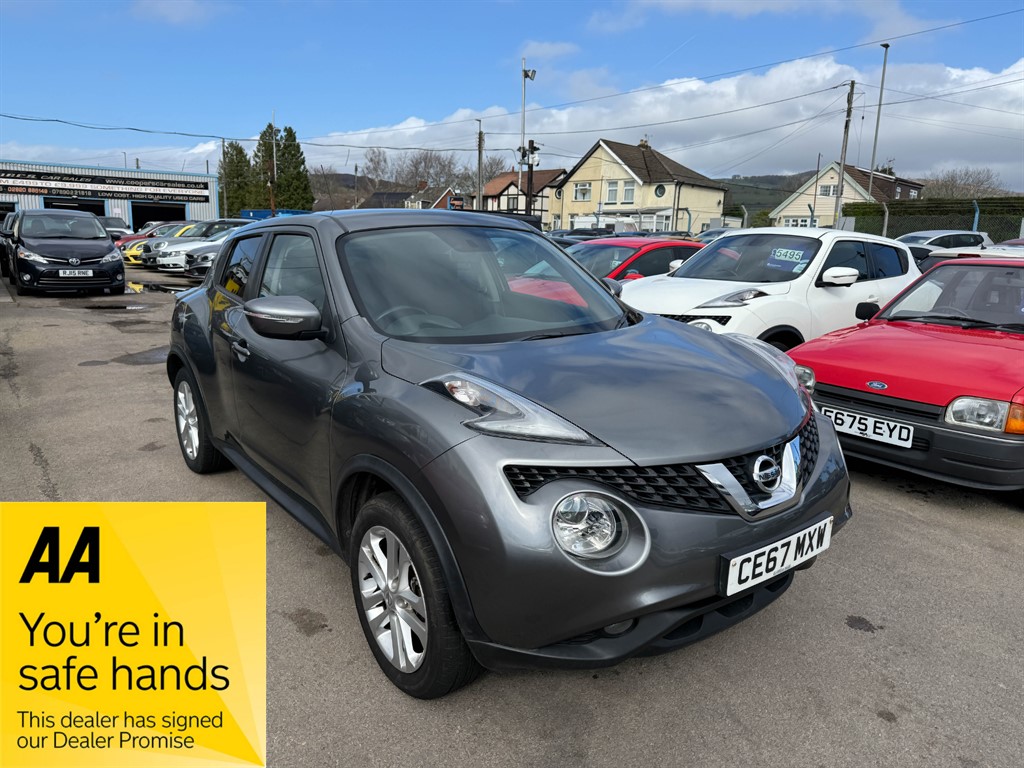 CaerphillyInsurance Group 11, 1 Previous Owner, Nissan Juke 1.2 Acenta in metallic grey. A lovely example, just 58k miles from brand new. This 2017 hatchback stands out with its striking grey exterior and practical fivedoor design, making it an ideal choice for both city driving and weekend getaways. Enjoy the benefits of alloy wheels that not only enhance the vehicle's appearance but also contribute to a smoother ride. Good spec too including Bluetooth Hands Free, Bluetooth Audio Streaming, Climate Control, A/C, Alloy Wheels, USB etc. Don't miss out on this fantastic opportunity to own a stylish and versatile vehicle. Contact us to book a test drive today or call 02920885149.. 12v Socket,Adjustable Steering Wheel,Air Conditioning,Alarm,Alloy Wheels,Anti Lock Brakes,Aux Input,Bluetooth Audio Streaming,Bluetooth Telephone Hands Free,CD Radio,Central Locking,Climate Control,Cloth Upholstery,Cupholders,Driver Airbag,Electric & Heated Door Mirrors,Front & Rear Electric Windows,Front Fog Lights,Fuel Computer,Height Adjustable Drivers Seat,Immobiliser,ISOFIX,Metallic Paint,Passenger Airbag,Power Assisted Steering,Remote Central Locking,Split Folding Rear Seats,Traction Control,Trip Computer,Tyre Pressure Monitor,USB