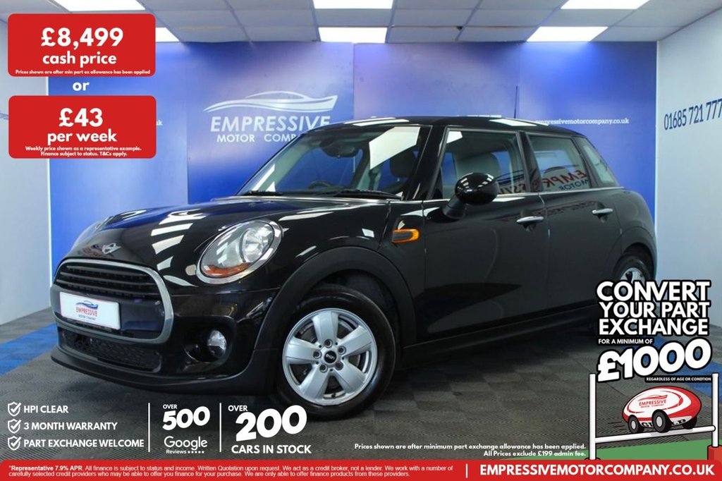 Merthyr TydfilInsurance Group 18, 2 Previous Owners, ****MAGNIFICENT MINI**** Just in! This Stunning 2017 MINI HATCH 1.5 Cooper Hatchback 5dr Petrol Manual Euro 6 (s/s) (136 ps) Finished In Black! 54,195 miles 1.5L petrol 6 speed manual 15" alloy wheels DAB radio Bluetooth Air conditioning Start stop Traction control USB Aux Electric wing mirrors .12Volt Socket in Front Centre Console, 15in Alloy Wheels Heli in Silver, 3 Point Seatbelts on all Seats, 3rd Brake Light Red, Air Conditioning Manual, Airbags for Driver and Front Passenger 6 Airbags as Standard, Alarm and Immobiliser Thatcham CAT 1, AntiLock Braking System ABS, Bluetooth Hands Free Function with USB Audio, Body Coloured Fuel Filler Cap in Rear Right Side Panel Linked to Central Locking, Boot Release via Remote Control, Brake Force Display, Brake Pad Wear Indicator, Chrome Bezels around Rear Lights and Headlights, Colour Line Carbon Black, Condition Based Service, Crash Sensor, Cupholders Two in Front and One in the Rear Centre Console, DAB Tuner, Daytime Driving Lights, Decorative Rings Surrounding Dashboard Instruments in Chrome Plated, Door Handles Chrome Plated, Door Sill Finishers Metal Look and Model Dependent Lettering, DTC Dynamic Traction Control with EDLC Electronic Differential Lock Control, Dynamic Stability Control DSC, Embellisher at Bottom Edge of All Windows Chrome Plated, Exhaust Tailpipe Visible Single Round with Chrome Finisher, Exterior Mirrors Aspheric on Drivers Side Electrically Adjustable, External Visible VIN, Firework Cloth Carbon Black, Foldable Rear Backrest 6040, Follow Me Home Function, Front Fog Lights, Front Passenger ISOFIX and Airbag DeActivation Switch, Front Side Indicators Orange, Fuel Pump Automatic CutOff in Crash Situation, Gearshift Lever Knob Plastic, GearshiftSelector Lever and Handbrake Lever Gaiters in Sensatec Artificial Leather, Halogen Lights for Low Beam and High Beam Headlights, Handbrake Lever Grip Plastic, Headlight BeamThrow Control Electrical with Manual Adjustment, Headliner Satellite Grey, Headrests For All Seats Manually Adjustable, Heated Mirrors and Windscreen Washer Jets, Heated Rear Window with Automatic Deactivation, Heated Window Heater, Heater with Mechanical Control and RecirculatingAir Button, Intelligent Emergency Calling ECall, Interior Door Handles Chrome Plated, Interior Lights Integrated into Centre Front Headliner, Interior Mirror Mechanical AntiDazzle, Interior Surface Haze Grey, Interior Trim Hazy Grey, Knee Roll in Hard Plastic on Dashboard Carbon Black, Lashing Eyes in Luggage Compartment, Locking System with Central Locking, Luggage Compartment Light, Mechanical Seat Adjustment Six Way Drivers Seat, Microfilter, Midnight Black, MINI Central Display with Illuminated Ring, MINI Mobility