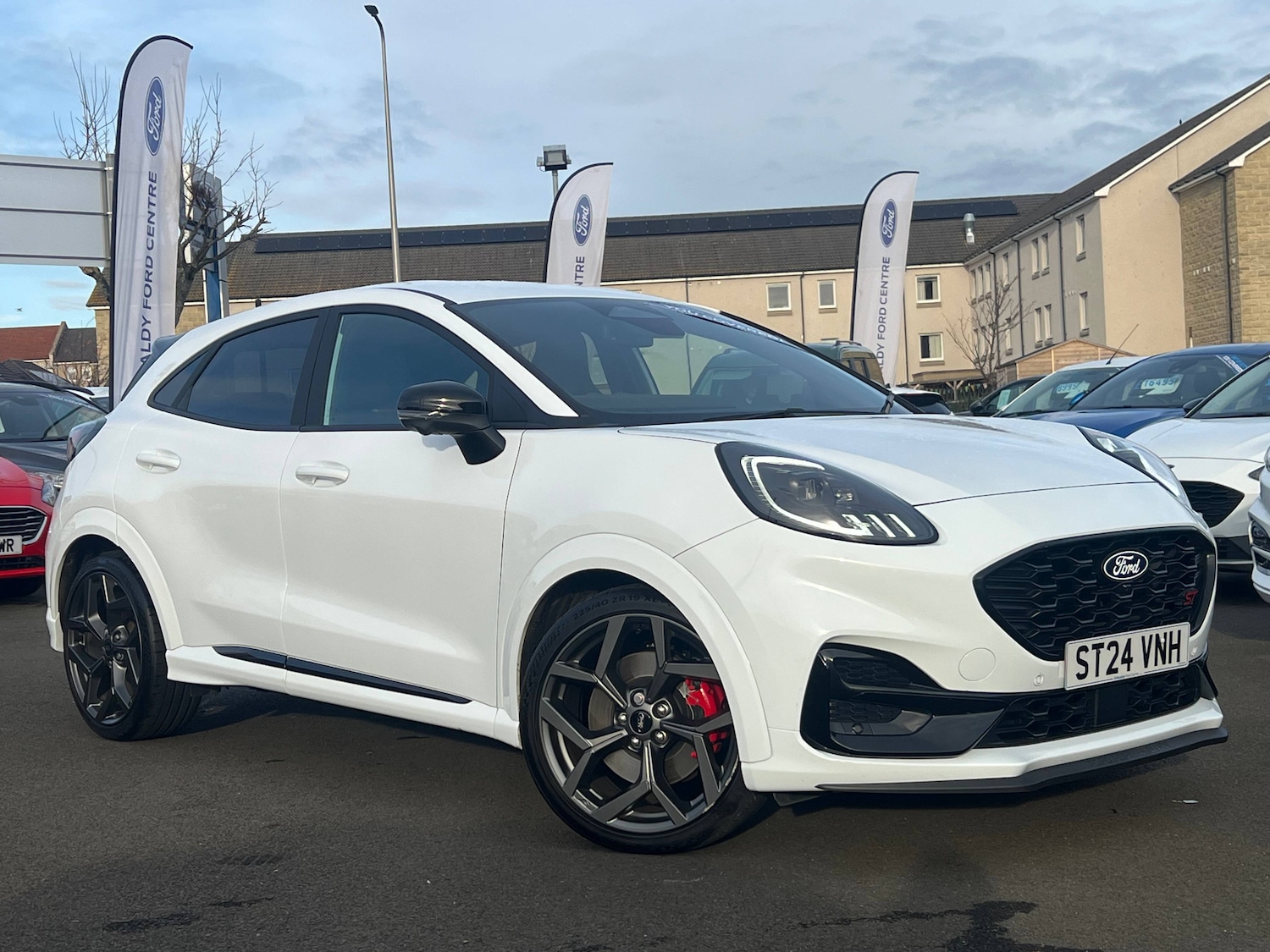 0 Previous Owners, 3 rear seatbelts, Child safety lock, Electronic stability control (ESC) and hill start assist, Precollision assist with autonomous emergency braking, pedestrian/cyclist detection and postcollision braking, Red brake calipers, Tyre pressure monitoring system (TPMS), Driver impairment monitor, Emergency call service, Ford easy fuel, Full digital 12.8 inch instrument cluster, Lane keeping aid with lane departure warning, Power assist steering, Power lift tailgate, Selectable drive modes (normal, sport, eco, track), Speed sign recognition, Automatic headlights with rain sensing wipers and auto high beam, Front fog lamps, Glarefree matrix LED headlamps, Large rear roof spoiler, LED daytime running lights, LED rear lamps, LED third brake light, Power foldable heated door mirrors with puddle lamps and puma logo protection, Quickclear heated windscreen, Rear privacy glass, Rear side wing doors, Rear wiper, Solid paint, Unique ST body styling kit including wing mirrors and Ford Performance embossed splitter, 3 seat bench in 2nd row, Centre console with armrest and stowage, Electronic automatic temperature control (EATC), Ford megabox extended bootspace, Ford Performance seats premium synthetic leather upholstery, Front and rear head restraints, Front floor mats, Manual 6 way driver seat adjust with lumbar adjustment, Manual 6 way passenger seat with lumbar seat adjustment, Single front passenger seat, ST flat bottomed steering wheel with metal grey stitching, Driver assistance pack with blind spot information system Puma for automatic transmission, Winter pack Puma, Solid Frozen white, ST suspension, Ford Performance seats premium synthetic leather Black with synthetic suede inserts and red stitching, Keyless entry and power start button, Keyless start and wireless charger, Thatcham alarm, 12 inch landscape touchscreen display with wireless apple car play and android auto premium BandO audio system with 10 speakers, Ford pass connect and emergency assistance, Ford SYNC4 with connected navigation, 19 inch alloy wheels with magnetite dark finish, Tyre inflation kit
