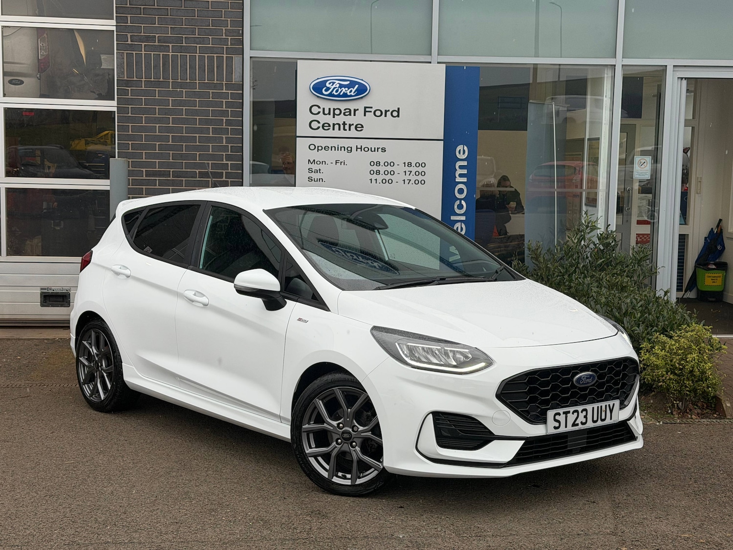 Insurance Group 17, 0 Previous Owners, 3 point seatbelts on all rear seats, ABS+EBA, Curtain airbags, Driver and passenger airbags, Drivers knee airbag, Electronic stability control with hill start assist, Front passenger airbag deactivation, Front side airbags, Seatbelt warning, Two tone horn, Tyre pressure monitoring system, Bluetooth system, Cruise control with active speed limiter, Electric power steering, Ford easy fuel, Ford SYNC 3 Navigation system incl 8 inch touchscreen, 7 speakers, FordPass connect, Apple carplay, android auto, voice control and emergency assistance, Rear parking distance sensors, Selectable drive modes (Normal, Sport, Track), Trip computer, Body colour bumpers, Body colour door handles, Body colour large rear spoiler, Body coloured electrically operated and heated door mirrors with side indicators, Cornering front fog lights, Electric front windows/one touch facility, Electric rear windows, LED Night signature to rear lights, LED projector low beam headlamps with LED daytime running lights, Quickclear heated windscreen, Rain sensing wipers and auto dimming rear view mirror, Rear privacy glass, Rear wiper, Solid paint, Unique STLine upper grille and full bodystyling kit with STLine wing badges, 3 spoke flat bottomed leather steering wheel, 60/40 split folding rear seat, Adjustable head restraints, Black headlining, Boot carpet, Centre console with opening armrest, 2x cupholders, 12v and USB, Chrome inner door handles, Cloth upholstery, Footwell illumination, Front floor mats in velour, Front map reading lights, Front seat and rear pockets, Illuminated glovebox, Leather gaiter, Load area light, Manual 2 way passenger seat adjust, Manual 4way driver seat adjust, Manual air conditioning, Overhead console with sunglasses holder, Pollen filter, Rake/reach adjustable steering wheel, Sensico wrapped steering wheel, Sports front seats, NCAP Pack Fiesta, Sports suspension, Keyless start with 'Ford Power' starter button, MyKey system, Remote central locking and engine immobiliser, Thatcham Cat.1 alarm, 2 USB ports, Auxiliary input socket, DAB Digital radio, Steering wheel mounted controls, 17 inch 5 spoke alloy wheels with rock metallic finish, Tyre repair kit