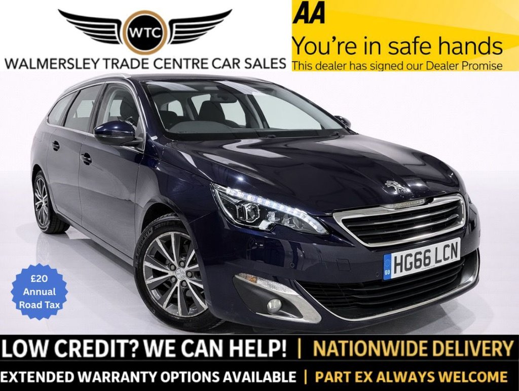 Bury1 Previous Owner, This practical and efficient Peugeot 308 SW 1.6 BlueHDi 120 Allure (HG66 LCN) is finished in Blue and offers an excellent combination of space, economy and comfort, making it an ideal family or motorway car. With 86,264 warranted miles and just 2 owners from new AND £20 ROAD TAX, this wellmaintained estate is powered by the reliable 1.6 BlueHDi diesel engine (120 ps) paired with a manual gearbox, delivering impressive fuel economy and low CO? emissions of just 88 g/km, helping to keep running costs down. The Allure specification provides a great level of equipment, including builtin satellite navigation, dualzone climate control, rear parking sensors, Bluetooth connectivity and DAB radio, ensuring a comfortable and connected driving experience. As an SW (estate) model, it offers excellent practicality, with a large boot capacity and flexible rear seating, making it perfect for families, work use or long journeys. Externally, the vehicle is complemented by alloy wheels and a sleek, modern design, while inside it provides a clean and comfortable cabin with intuitive controls. Supplied with 2 keys and logbook present, this Peugeot 308 SW represents fantastic value for money, offering low running costs, strong specification and excellent practicality. Walmersley Trade Centre Trusted Motor Trade Experts With over 27 years experience and proudly operating since 2011, we are committed to quality, transparency, and outstanding customer satisfaction. All vehicles are fully HPI checked and clear, supplied with 12month AA Breakdown Cover, and come with flexible warranty options for added peace of mind. We offer competitive finance packages to suit every budget, including: PCP available on vehicles up to 12 years old at the end of the agreement Finance available on vehicles up to 15 years old (older considered on a casebycase basis) Personal loan options ideal for topup loans or negative equity Finance available for customers with international driving licences or less than 12 months UK residency Part exchange always welcome. Call our friendly, knowledgeable team on 0161 637 7280 to book a test drive and experience the Walmersley difference. Please note: prices may be subject to an admin fee contact us for full details..Sat Nav + Rear Parking Sensors, Full main dealer history + 2 Keys + MOT, Touch Screen Dual Zone Climate Control , Very spacious + Huge Boot , Bluetooth + DAB Radio + Cruise control, 12V Accessory Power Point Front, 16in Alloy Wheels Diamond, Air Conditioning Automatic Dual Zone Climate Control, Alarm Ultrasonic, AntiLock Braking ABS Electronic Brake Force Distribution EBFD Emergency Braking Assistance EBA, Automatic Electric Parking Brake, Automatic Headlamps and Wipers, Bluetooth Telephone Facility, Curtain Airbags for Front and Rear Windows, DAB Digital Radio with 9.7in Multifunction Colour Touch Screen, Deadlocks, Door Mirror Shells Body Coloured, Driver and Front Passenger Front and Side Airbags, ESP Electronic Stability Programme, Electric Folding Door Mirrors with Courtesy Approach Lighting, Electric Power Assisted Steering, Electric Rear Windows, Electrochrome Rear View Mirror, Front and Rear Parking Sensors, Full LED Headlamps with Fully Integrated LED Daytime Running Lights, Halogen Front Fog Lights, Height Adjustment of Front Passenger Seat Seat Back Pockets and Lumbar Adjustment for Driver, ISOFIX Location Points Rear, Locking Wheel Bolts, Magic Flat Rear Seats, Mistral Nappa Leather Steering Wheel, One Touch Electric Front Windows, Programmable Cruise Control and Speed Limiter, Rear Lights LED, Remote Control Central Locking, Retractable Boot Cover, Rolling Code Transponder Immobiliser, Roof Rails Aluminium, Satellite Navigation, Three Point Inertia Reel Seat Belts On All Seats, Tinted Rear Side and Tailgate Windows, USB Connection