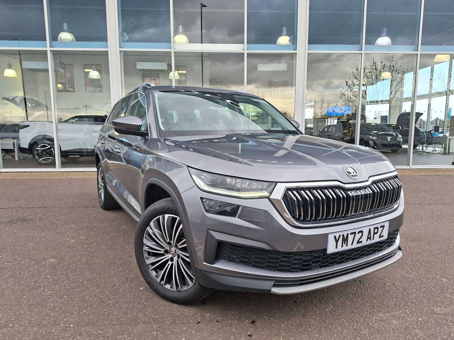 Insurance Group 20, 0 Previous Owners, This 2023 Skoda Kodiaq TSI SE L Executive is a superb example, having had only one owner since new. This Euro 6 compliant seven seater boasts a 1.5 litre petrol engine and comes in the well appointed SE L Executive trim. You'll appreciate the convenience of Bluetooth connectivity, heated front seats for those colder mornings, and front and rear parking sensors paired with a rear view camera to make manoeuvring effortless. The advanced Full LED Matrix headlights with Adaptive Front Light System, including cornering and all weather lighting, ensure excellent visibility in all conditions.With a brisk 060mph acceleration time of just 9.5 seconds, this Kodiaq offers a responsive driving experience. These features combined demonstrate how this particular vehicle stands out from others in its class, offering a blend of practicality, comfort, and advanced technology for families and individuals alike.
