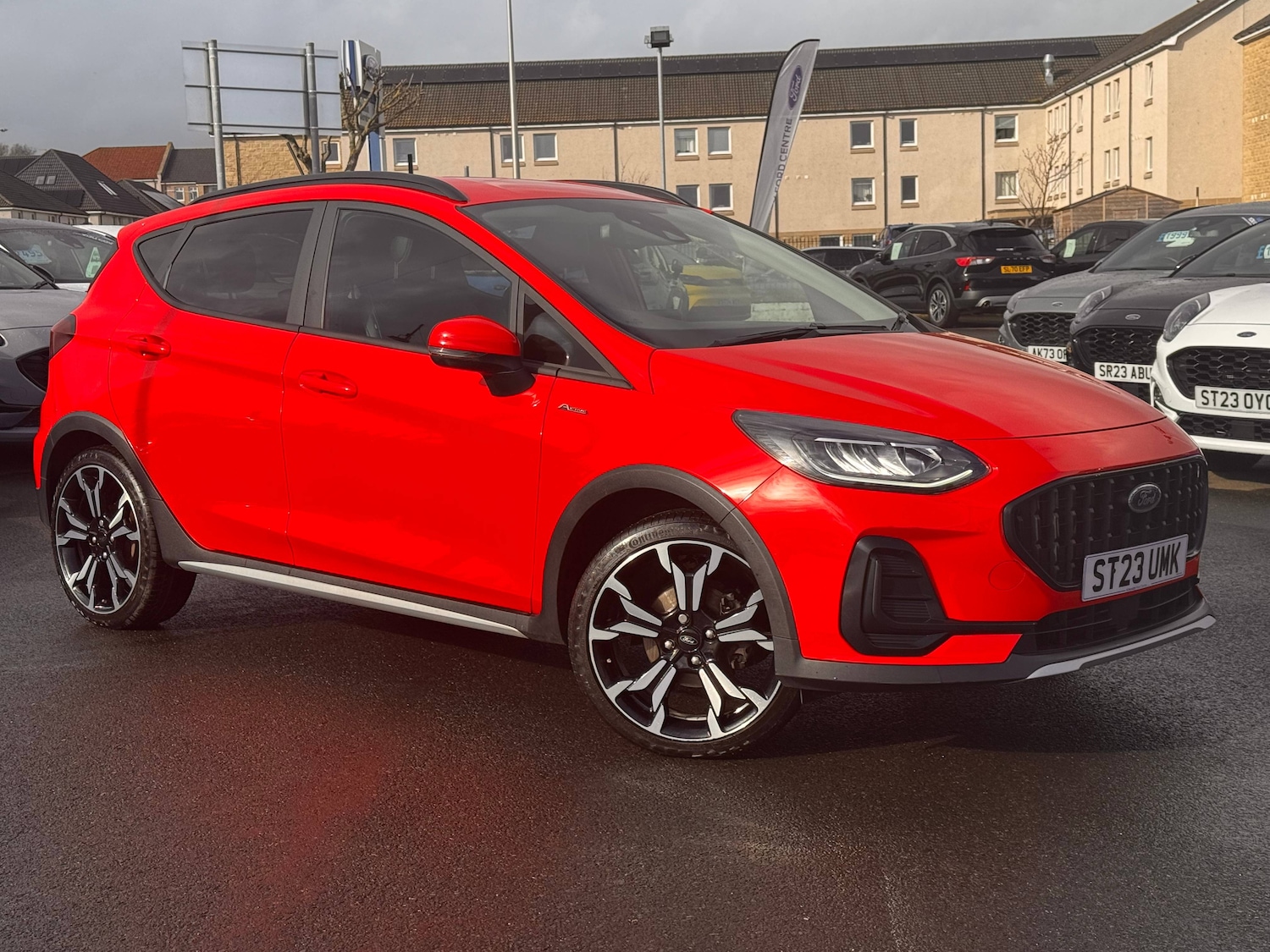KirkcaldyInsurance Group 14, 0 Previous Owners, 3 point seatbelts on all rear seats, Electronic stability control with hill start assist, Front and rear seat belt warning, Manual child lock in rear doors, Tyre pressure monitoring system, 4.2 inch Colour TFT Ice blue illumination analogue cluster, Cruise control with adjustable speed limiter and intelligent speed assist, Driver alert system, Electric power steering, Ford easy fuel, Ford SYNC 2.5 with DAB radio,8 inch screen, emergency assistance,Apple car play/Android auto, 2x USB, 6 speakers, Lane keep assist, Lane keeping aid, Rear parking distance sensors, Rear view camera, Selectable drive modes (Normal, Sport, Track), Traffic sign recognition, Trip computer, 3rd brake light, Auto high beam, Automatic headlights, Body colour bumpers, Body coloured electrically operated with side indicators, Electric front windows/one touch facility, Electric rear windows, LED headlights with LED daytime running light and integrated fog light, LED rear lights, Quickclear heated windscreen, Rain sensing wipers and auto dimming rear view mirror, Rear privacy glass, Rear side wing doors, Rear wiper, Rugged bodystyling kit with active front wing badges, Solid paint, 3 rear headrests, 3 seat bench in 2nd row, 4 way manually adjustable passenger seat, Adjustable head restraints, Centre console with opening armrest, 2x cupholders, 12v and USB, EATC Electronic Auto Temperature control, Leather gear knob, Manual 4way driver seat adjust, Premium floor mats, Sensico partial premium leather upholstery with blue stitching, Sensico wrapped steering wheel, Single front passenger seat, Winter pack [GTBAB] Fiesta, Rough road suspension with increased ride height adjust, Ford keyfree system with Keyless entry and keyless start, MyKey system, Remote central locking, Thatcham alarm with power door dead locks, 18 inch 5x2 spoke alloys with bicolour black machined finish, Tyre repair kit