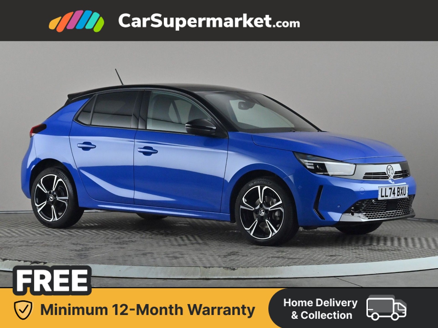 Insurance Group 19, 1 Previous Owner, Blue Corsa with 8,586 miles. Specification includes cruise control, parking sensors, lane departure warning, blind spot monitoring, traffic sign recognition, Apple CarPlay, Android Auto, Bluetooth, digital radio, and 17inch alloy wheels. Last serviced on 18 February 2026. MOT due 30 October 2027.