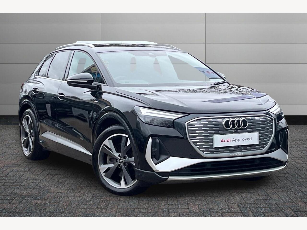 Whetstone0 Previous Owners, Audi connect safety and service (ecall), Audi drive select, Audi Smartphone Interface with wireless functionality, Audi Virtual Cockpit 10.25" display, Bluetooth interface, Camera based traffic sign recognition, Lane departure warning system, MMI Navigation Plus with high resolution 10.1 inch touchscreen colour display, Power operated tailgate, Progressive steering, Swerve assist and turn assist, 11KW onboard charger, 125kW DC charging capability, AC and DC charging access point positioned on the rear right, Compact etron charging system, Household plug type G (GB), Industry plug CEE 32 A/230 V/6 h/long + straight, Mode 3 AC charging cable 22 kW, 2 USBC ports with charge and data functions, Audi sound system with 8 speakers, DAB Digital radio, Acoustic glass windscreen, Aluminium roof rails, Body coloured door mirrors, Contrast bumpers in Manhattan grey, Driver's door mirror memory, Electrically adjustable/heated/folding/auto dimming door mirrors with integrated LED indications + kerb view function for passenger side, Frameless auto dimming interior rear view mirror, LED daytime running lights, Projection light in the exterior mirrors, etron logo projected from the underside of the exterior mirror onto the ground, S line badges on front wings, S line exterior styling, Side and rear window privacy glass, Single frame grille with a structured, closed surface within an octagonal shape, 3 zone automatic air conditioning, 4 way electric lumbar support for driver and front passenger, 40:60 Split folding rear seat or folded fully, Accent surfaces in gloss black centre console control panel, switch panel and trim on front doors in gloss black, Auxiliary air conditioning, Black cloth headlining, Comfort front centre armrest, Driver/passenger manual seat height adjustment, Front and rear head restraints, Front door sill trims with aluminium inlay, illuminated with S logo, Front/rear floor mats, Heated front seats, Stainless steel pedals, Gloss styling pack Q4 Etron, Non smoking pack Q4 Etron, 3x3 point rear seatbelts, Active vehicle alerting system (AVAS), Driver and front passenger airbag with passenger airbag deactivation, Electric child locks, Front side airbags with head airbags and interaction airbag, Presense front with pedestrian and cyclist detection, Seatbelt warning, Tyre pressure loss indicator, Warning triangle and first aid kit, Anti theft alarm, Antitheft wheel bolts, Keyless Go, Aluminium look interior elements, Inlay in dark matt