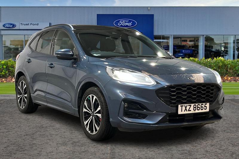 Insurance Group 21, 12.3 digital colour instrument cluster, Ford easy fuel, Ford SYNC 3 with 8 TFT LCD touchscreen, App Link, andriod auto/apple carPlay, emergency assistance and navigation with Ford pass connect, Front and rear parking sensors, Geo awareness, Hands free power tailgate, Lane keeping aid with lane departure warning, Power assist steering, Rear view camera, Selectable drive modes, Service interval indicator, Auto headlamps with high and low beam, Black roof rails, Body colour bumpers, Day/night rear view mirror, Front LED fog lamps, Large rear roof spoiler, LED daytime running lights, LED rear lights, Power folding, electrically adjustable and heated door mirrors with puddle lights, Power front/rear windows with global close, Power opening panoramic roof, Quickclear heated windscreen, Rain sensing wipers, Rear privacy glass, Rear side wing doors, Rear wiper, ST Line body styling kit with unique front and rear fascia and bumper, rear painted diffuser, front painted skid plates, dark mesh upper grille, ST Line front scuff plates, Third brake light, Twin exhausts, 2nd row sliding seats with 60:40 split, Alloy pedals, Centre console with electronic parking brake, Dark headlining and pillars, Electronic automatic temperature control (EATC), Flat bottomed leather steering wheel in sensico with red stitching, Front and rear head restraints, Heated passenger and driver seats, Heated rear seats, Heated steering wheel, Partial premium touch Sensico with black cloth inserts and red