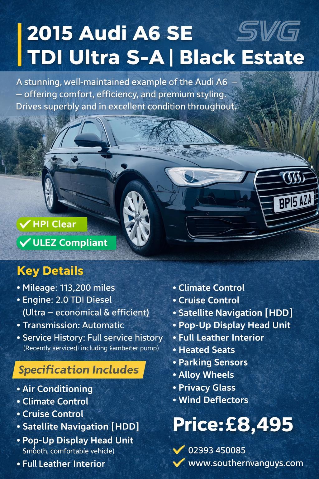 2 Previous Owners, 2015 AUDI A6 SE TDI ULTRA SA BLACK ESTATE 113200 miles Full Service history (Recent camp belt water pump) 2.0 Diesel Automatic Transmission Air con Pop Up Display Head Unit Navigation HDD Cruise control Climate control Full leather seats Heated seats Parking sensors Alloy wheels Privacy glass Window Wind Deflectors Long mot 3 Months/3000 miles warranty included Stunning example £8495 Finance available (Good & Bad credit) Px welcome (Trade value) Plenty more stock available on site Southern van guys6a Southampton RoadPorchester Po6 4RJ 02393 430085 www.southernvanguys.com