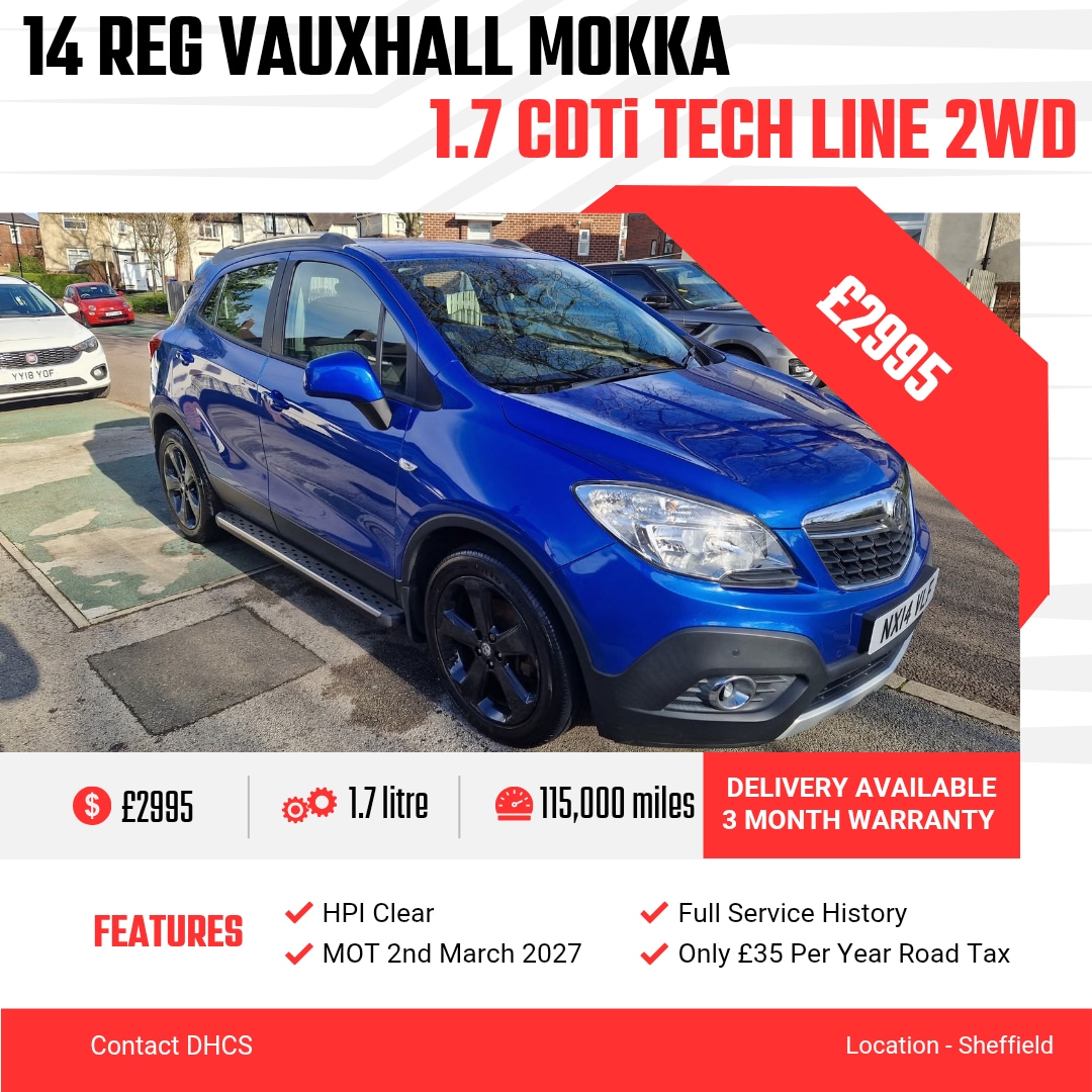 SheffieldInsurance Group 12, 1 Previous Owner, Full Service History, £2995**F/S/H**£2995**6SPEED**£2995 14 REG VAUXHALL MOKKA 1.7 CDTi TECH LINE 2WD6 SPEED MANUAL GEARBOX 115000 MILES WITH FULL HISTORY MOT 2nd MARCH 2027 ONLY £35 ROAD TAX PER YEAR 1 FORMER KEEPER LAST OWNER 9YRS HPi CLEAR FULL REPORT COMES WITH SALE OF CAR FULL LEATHER INTERIOR FRONT HEATED SEATS HEATED STEERING WHEEL STEREO SYSTEM WITH BUILT IN SAT NAV PARKING SENSORS DASH CAM FITTED SIDE STEPS 2 X REMOTE LOCKING KEYS CAR DRIVES WELL NO ISSUES ANY INSPECTION / TESTDRIVE WELCOME BASED IN SHEFFIELD (DELIVERY AVAILABLE ) CALL O79OO458817 TO ARRANGE A VIEWING ** PART EX CONSIDERED AT TRADE VALUE ONLY