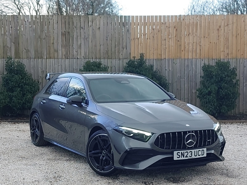 0 Previous Owners, This is a Click & Collect location. Find your perfect car online and well bring it closer to you. Reserve your favourite for only £99 and arrange collection to this branch. Contact us to learn more. 19" AMG 5 twin spoke light alloy wheels aerodynamically optimised painted in matt black with high sheen rim flange, 10.25 inch touchscreen central media display, Attention assist, Cruise control + speed limiter, DYNAMIC SELECT with driving programs (Slippery, Comfort, Sport, Sport+ and Individual), Head up Display, Smartphone integration with Apple CarPlay and Android auto, Wireless charging, AMG suspension, DAB Digital radio, Mercedes Benz advanced sound system (225 W) with 10 speakers, 1 central speaker, speakers on doors, a tweeter on door,one sub woofer + boost amplifier, AMG body styling AMG front apron with front splitter and AMG rear apron and visible exhaust tailpipe trim elements, AMG Front apron with flics as air deflector elements on the outer air intakes, AMG radiator grille with twin blade lamella and AMG Lettering, AMG Rear apron with specific diffuser look with four vertical fins and two round chrome plated tailpipe trim elements with a diameter of 90 mm, Heat insulating dark tinted rear and rear side windows, Multibeam LED headlamps with adaptive highbeam assist and cornering function, Panoramic sliding sunroof, Privacy glass, AMG Performance steering wheel in nappa leather, Heated front seats, Sports seats with integrated headrests, Two zone thermotronic luxury automatic climate control, Aerodynamic pack A Class, AMG night pack A Class, Light and sight pack A Class, Mirror package A Class, Parking pack with 360 degree camera A Class, Seat comfort pack A Class, USB pack plus A Class, Active brake assist includes forward collision warning system with autonomous braking, Adaptive brake assist with hold function and hill start assist, Electronic parking brake, Guard 360 degree vehicle protection, Keyless Go, Black seatbelts
