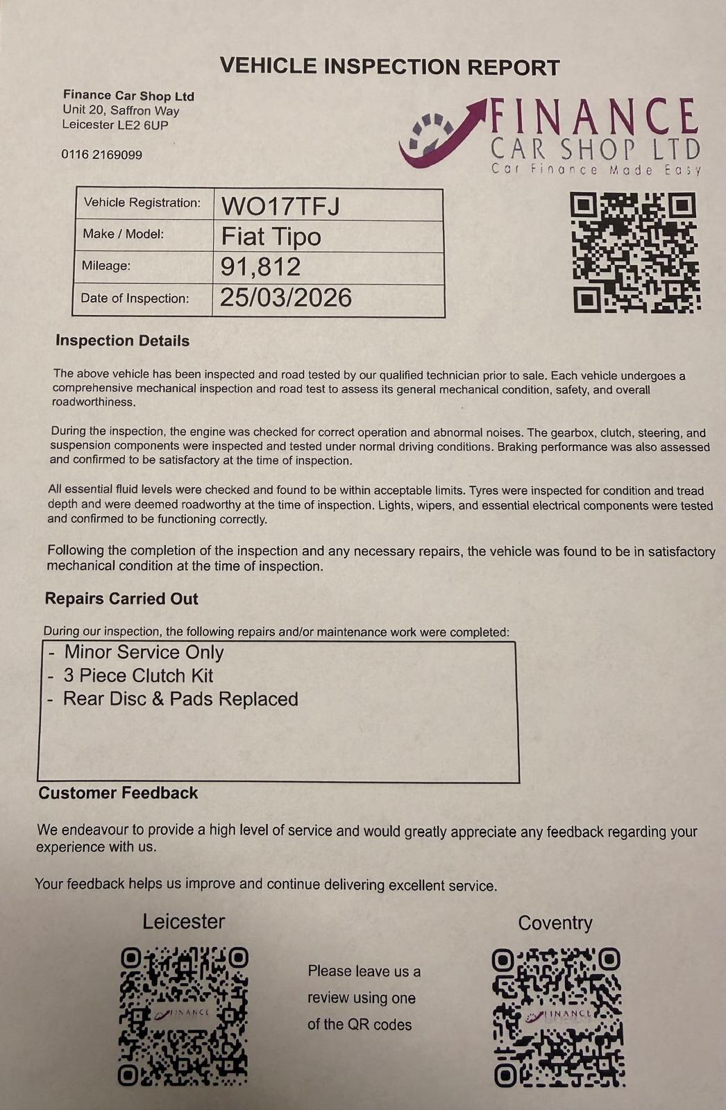 LeicesterInsurance Group 7, JUST SERVICED If you're looking for a comfortable, practical, and economical family car, this Fiat Tipo 1.4 MPI Easy (Euro 6) 5door is a fantastic choice. With its smooth drive, generous interior space, and modern features, its perfect for daily commuting or family trips.Key Features:1.4L Petrol Engine Reliable and economicalEuro 6 compliant Lower emissions 5 Doors Easy access for passengers Spacious cabin and large boot Ideal for familiesSmooth manual gearbox for a comfortable driveEquipment Includes:Air conditioning Steering wheel controlsElectric windows & mirrorsTouchscreen infotainment system+ 6 MONTHS WARRANTY INCLUDED + 6 MONTHS BREAKDOWN COVER + EXTENDED WARRANTY AVAILABLE + FINANCE OPTIONS AVAILABLE UPON REQUEST + DELIVERY CAN ONLY BE ARRANGED ONCE THE VEHICLE HAS BEEN VIEWED & INSPECTED IN PERSON AT OUR PREMISES + PHOTO ID IS REQUIRED FOR ALL VIEWINGS AND TEST DRIVES + WE CAN BE REACHED VIA WHATSAPP ON 07458 300017 FEEL FREE TO MESSAGE US + PLEASE NOTE, THE PRICE IS FIXED ON THIS VEHICLE. KINDLY BE AWARE OF THIS PRIOR TO ARRANGING A VIEWING + WE HAVE OVER 50 VEHICLES IN STOCK. AS NOT ALL VEHICLES ARE HELD ON SITE, PLEASE ENSURE YOU CALL IN ADVANCE BEFORE MAKING YOUR JOURNEY + BANK TRANSFER ONLY + MORE CARS AVAILABLE AT:WWW.FINANCECARSHOPLTD.CO.UK +