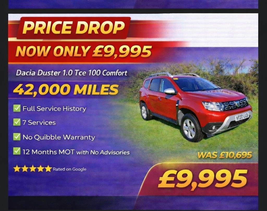 Insurance Group 14, NOW REDUCED TO JUST £9,995 FROM £10,695 for a STRICT LIMITED TIME SALE, this Dacia Duster 1.0 TCe 100 Comfort MUST BE SOLD BY TUESDAY 1ST APRIL AT 5PM with NO EXCEPTIONS..... This is a genuine £700 saving and the price will return to £10,495 after this deadline if not sold...... With just 42,000 miles from new and a FULL SERVICE HISTORY WITH 7 DOCUMENTED SERVICES, this is a very clean well maintained example that drives exactly as it should and is a credit to its previous owner... This vehicle has been professionally prepared and is in excellent condition inside and out. It will be supplied with 12 MONTHS MOT WITH NO ADVISORIES, a FULL SAFETY INSPECTION and our NO QUIBBLE WARRANTY for complete peace of mind.... These Dusters are known for their reliability practicality and low running costs and this example represents OUTSTANDING VALUE at this price point.We specialise in sourcing the very best low mileage high quality vehicles. Mark Evans Car Sales is based in St Agnes Cornwall TR5 0PA. We pride ourselves on our honesty integrity and five star service. Please take a moment to read our five star Google reviews, we are very proud of them. The Evans family has been in the motor trade in Cornwall for over 50 years and we continue to work hard to uphold our reputation for quality and trust.