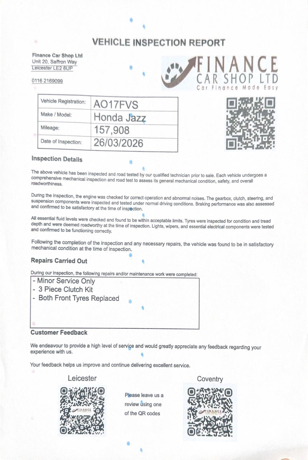 Leicester1 Previous Owner, A fantastic example of the Honda Jazz, known for its reliability, practicality, and excellent fuel economy. Perfect for city driving, commuting, or a small family.Key Details:1.3 iVTEC Petrol Engine Smooth, reliable, and economicalEuro 6 ULEZ CompliantService HistoryJust Serviced Ready to drive away1 Former KeeperPractical 5 Door Hatchback with spacious interiorFeatures Include:Air ConditioningBluetooth Connectivity Cruise Control Multifunction Steering WheelUSB & AUX ConnectivityElectric Windows & MirrorsRemote Central LockingDaytime Running LightsLarge boot and clever interior space, a signature feature of vehicles from Honda.+ 6 MONTHS WARRANTY INCLUDED + 6 MONTHS BREAKDOWN COVER + EXTENDED WARRANTY AVAILABLE + FINANCE OPTIONS AVAILABLE UPON REQUEST + DELIVERY CAN ONLY BE ARRANGED ONCE THE VEHICLE HAS BEEN VIEWED & INSPECTED IN PERSON AT OUR PREMISES + PHOTO ID IS REQUIRED FOR ALL VIEWINGS AND TEST DRIVES + WE CAN BE REACHED VIA WHATSAPP ON 07458 300017 FEEL FREE TO MESSAGE US + PLEASE NOTE, THE PRICE IS FIXED ON THIS VEHICLE. KINDLY BE AWARE OF THIS PRIOR TO ARRANGING A VIEWING + WE HAVE OVER 50 VEHICLES IN STOCK. AS NOT ALL VEHICLES ARE HELD ON SITE, PLEASE ENSURE YOU CALL IN ADVANCE BEFORE MAKING YOUR JOURNEY + BANK TRANSFER ONLY + MORE CARS AVAILABLE AT:WWW.FINANCECARSHOPLTD.CO.UK +