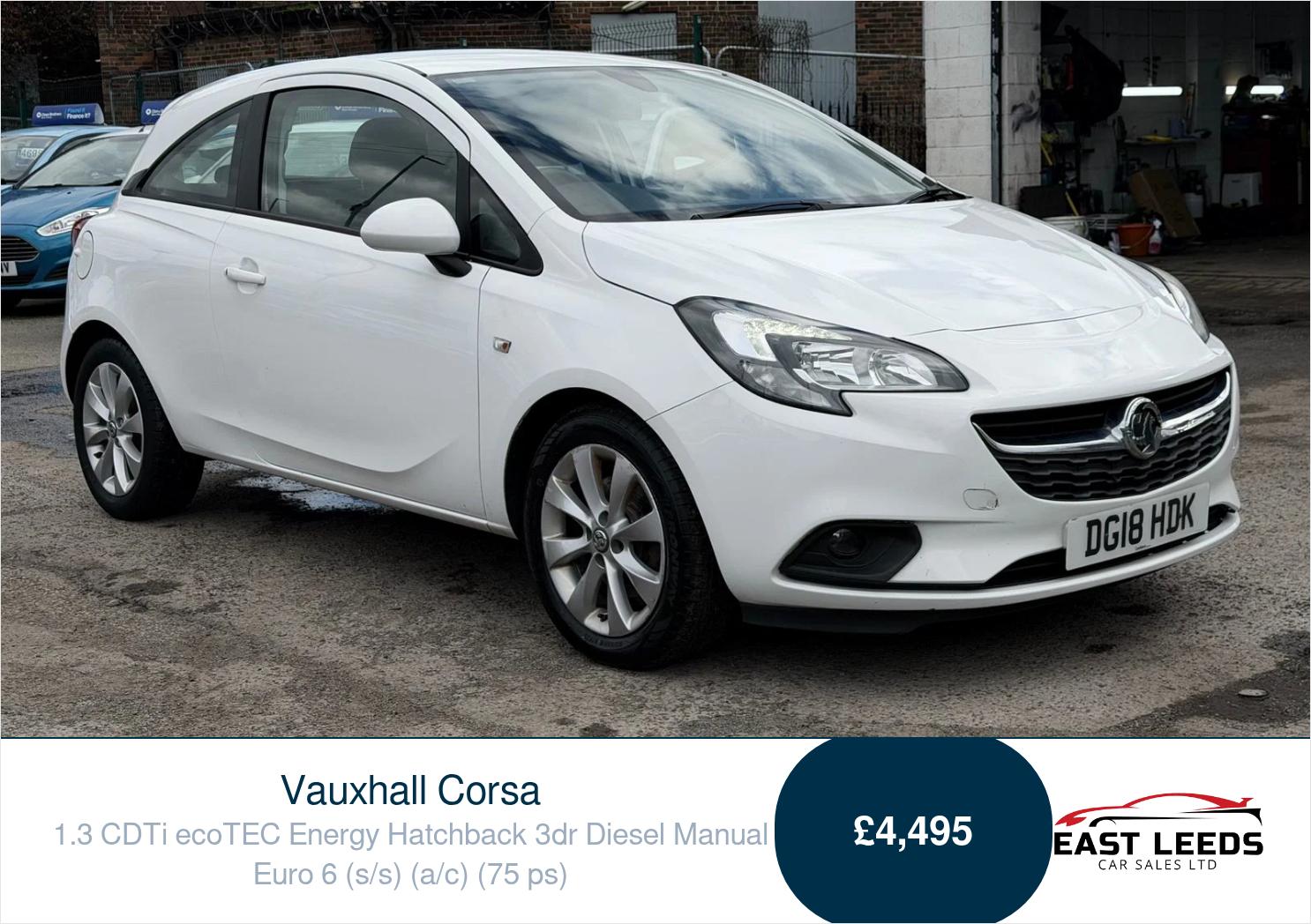 LeedsInsurance Group 7, 1 Previous Owner, Full service history, This Vehicle come with a excellent service history with a full service recently carried out, Only 2 owners from new comes with 2x Keys, and a MOT 29 03 2027. Cruise Control with Speed Limiter, Air Conditioning, Automatically Dimming Anti Dazzle Rear View Mirror, 16in Alloy Wheels 4 Twinspoke Silver, Daytime Running Lights LED, R4.0 IntelliLink Touch Screen Infotainment System. Introducing the Vauxhall Corsa 1.3 CDTi ecoTEC Energy Hatchback Are you looking for a stylish, reliable car that s perfect for city driving Look no further This stunning white Corsa from East Leeds Car Sales is your ideal companion. With only two previous owners and an excellent service history , including a full service just completed, you can drive with confidence Experience the freedom of cruise control with a speed limiter , making long trips a breeze, while the air conditioning keeps you cool on those warm days . No more annoying glare from behind the automatically dimming rear view mirror is designed for your comfort Ride in style with 16 inch silver alloy wheels and bright LED daytime running lights, ensuring you turn heads everywhere you go Plus, the R4.0 IntelliLink touch screen infotainment system brings your favourite tunes and navigation right to your fingertips. With an impressive MOT valid until 29 03 2027 and the added convenience of two keys , this Corsa is ready for you to make it your own Don t miss out on the chance to drive home this fantastic hatchback from East Leeds Car Sales book your test drive today