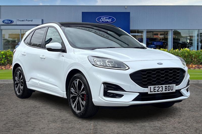 Insurance Group 20, 12.3 digital colour instrument cluster, Ford easy fuel, Ford SYNC 3 with 8 TFT LCD touchscreen, App Link, andriod auto/apple carPlay, emergency assistance and navigation with Ford pass connect, Front and rear parking sensors, Hands free power tailgate, Lane keeping aid with lane departure warning, Power assist steering, Rear view camera, Selectable drive modes, Service interval indicator, Auto headlamps with high and low beam, Black front lower fascia + upper tailgate, Black hinge cover + spoiler, Black KUGA lettering + STLine badge, Black mirror caps + shark fin, Black roof rails, Day/night rear view mirror, Front LED fog lamps, Large rear spoiler, LED daytime running lights, LED rear lights, Power folding heated door mirrors with puddle lights, Power front/rear windows with global close, Power opening panoramic roof, Privacy glass, Quickclear heated windscreen, Rear side wing doors, Rear wiper, ST Line body styling kit with unique front and rear fascia and bumper, rear painted diffuser, front painted skid plates, dark mesh upper grille, ST Line front scuff plates, Third brake light, Twin exhausts, 10 way power adjustable drivers seat, 2nd row sliding seats with 60:40 split, 8 way manual passenger seat including lumbar support and height adjust, Alloy pedals, Centre console with electronic parking brake, Dark headlining and pillars, Electronic automatic temperature control (EATC), Flat bottomed leather steering wheel in sensico with red stitching, Front and rear head