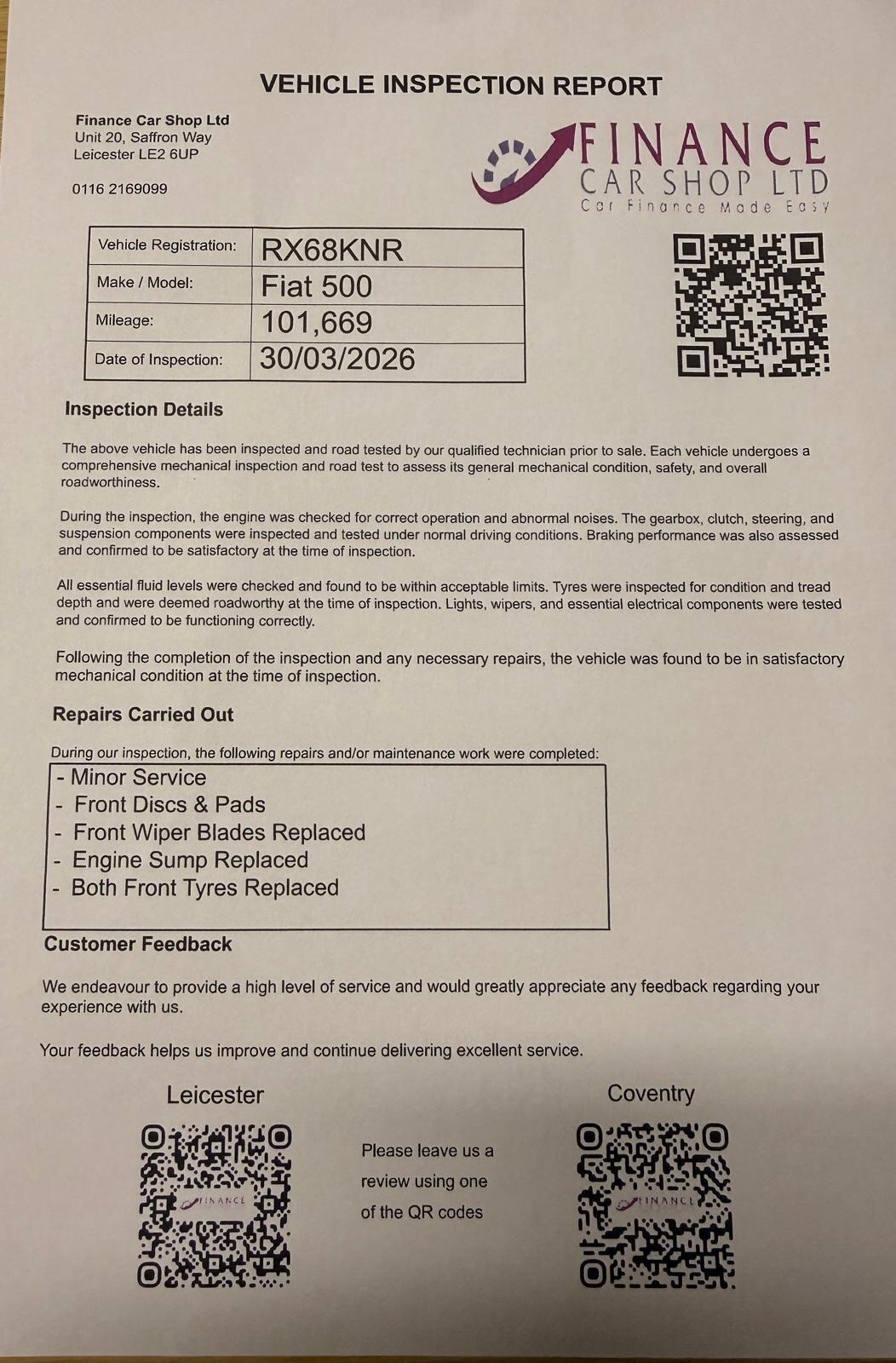 LeicesterInsurance Group 8, 0 Previous Owners, JUST SERVICED, PANORAMIC ROOF, 1 LADY OWNER FROM NEW, This Fiat 500 1.2 Lounge is the perfect city carstylish, fun to drive, and economical. Its 1.2L petrol engine with start/stop technology delivers great fuel efficiency, while the Lounge trim adds a touch of premium style to your everyday drives.Key Features:1.2L Petrol Engine Smooth, reliable, and fuelefficientEuro 6 compliant ULEZ friendlyStart/Stop (s/s) technology3 Door Hatchback Compact and easy to parkStylish Lounge trim interiorAir Conditioning / Climate ControlUSB connectivityElectric front windowsRemote central lockingAlloy wheelsSafety & Convenience:ABS & Electronic Stability ControlMultiple airbagsTyre pressure monitoring systemWhy choose this car?Iconic design and easy city drivingEconomical to runFun and comfortable to driveHighspec Lounge trim for extra style+ 6 MONTHS WARRANTY INCLUDED + 6 MONTHS BREAKDOWN COVER + EXTENDED WARRANTY AVAILABLE + FINANCE OPTIONS AVAILABLE UPON REQUEST + DELIVERY CAN ONLY BE ARRANGED ONCE THE VEHICLE HAS BEEN VIEWED & INSPECTED IN PERSON AT OUR PREMISES + PHOTO ID IS REQUIRED FOR ALL VIEWINGS AND TEST DRIVES + WE CAN BE REACHED VIA WHATSAPP ON 07458 300017 FEEL FREE TO MESSAGE US + PLEASE NOTE, THE PRICE IS FIXED ON THIS VEHICLE. KINDLY BE AWARE OF THIS PRIOR TO ARRANGING A VIEWING + WE HAVE OVER 50 VEHICLES IN STOCK. AS NOT ALL VEHICLES ARE HELD ON SITE, PLEASE ENSURE YOU CALL IN ADVANCE BEFORE MAKING YOUR JOURNEY + BANK TRANSFER ONLY + MORE CARS AVAILABLE AT:WWW.FINANCECARSHOPLTD.CO.UK +