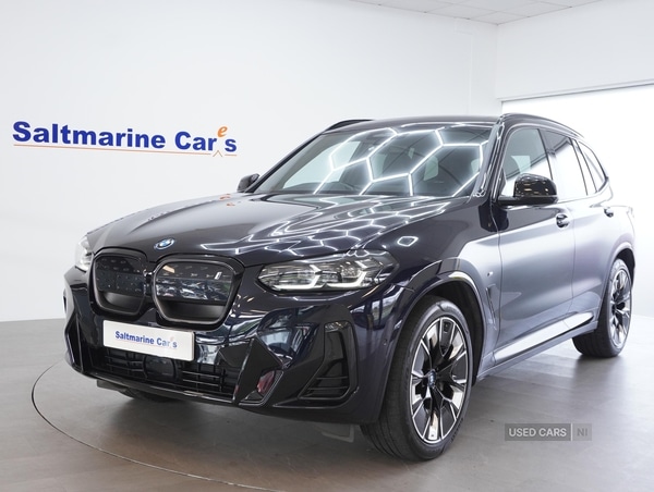 Dungannon0 Previous Owners, Exceptional December 2022 BMW iX3 80kWh M Sport Pro Auto (286PS), finished in Carbon Black metallic with just 19530 miles.Features include: 20' Alloy Wheels, Panoramic Sunroof, Park Distance Control with 360 Cameras, LED Running Lights & Headlights, LED Rear Lights, M Sport Body Styling, Powerfolding Door Mirrors, Privacy Glass, Black Window Surrounds, Black Roof Rails, Rear Spoiler, Electric Tailgate, Heated Vernasca Leather Seats with Signature Blue Stitching, M Sport Signature Seatbelts, Head Up Display, Virtual Cockpit, Driving Mode Options, iDrive Infotainment Centre, Satellite Navigation, DAB Radio, Bluetooth Connectivity, Lane Keep Assist, Forward Assist, Blind Spot Assist, Heated Seats, Electric Seats with Driver's Memory Option, Leather Heated M Sport Steering Wheel, Dual Climate Control, Cruise Control, Harman Kardon Sound System, Alloy Pedals, M Sport Sill Protectors, and much more.Protected from new with factoryfitted mats.Saltmarine are a family business, with our motto being: Saltmarine Cares. We are situated 20 minutes from Sprucefield at Junction 14 on the M1 Motorway (the turnoff before Dungannon).For a more detailed description, please see the video on our website