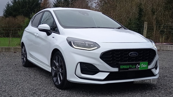 DrumquinInsurance Group 15, 0 Previous Owners, October 2022 Ford Fiesta 1.0 Mild Hybrid mHEV 125BHP ST Line Edition 5 Door finished in Moon White with Bluetooth, Sat Nav, Parking Sensors, Unique ST Line grille and bodystyling kit and large rear spoiler, Sports Front Seats, Air Con, Fog Lights, Keyless start, Alloy Wheels and Full Service history. This is a NI car so no extra duty and and VRT 2279 Euro. Comes fully serviced with a 6 month Warranty. Finance Facilities available.