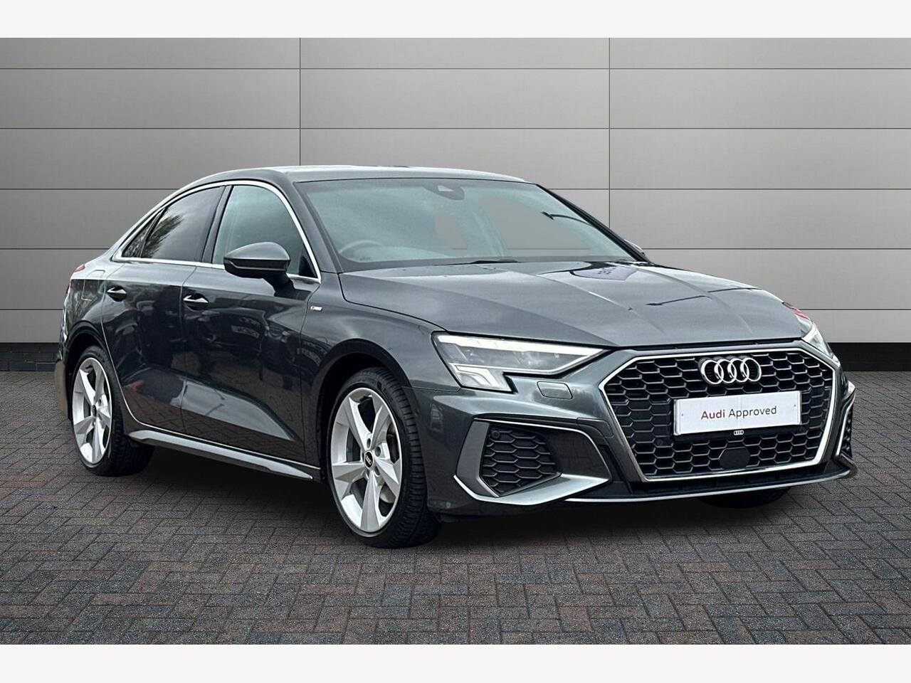 StockportInsurance Group 25, 2 Previous Owners, Audi connect emergency call and service, Audi drive select (Auto, Comfort, Dynamic, Efficiency and Individual), Audi smartphone interface, Audi Virtual Cockpit 10.25" digital and colour instrument cluster, Automatic start/stop system with recuperation, Bluetooth interface, Collision avoidance assistant, Electromechanical power speed sensitive steering, Lane departure warning system, MMI Navigation Plus with high resolution 10.1" colour touch screen display, Service indicator, Voice control system with natural language interaction, 1xUSBA and 1xUSBC connection, 6 passive loudspeakers, CD player, DAB Digital radio, Acoustic glass windscreen, Aluminium window trim, Auto dimming frameless rear view mirror, Body colour exterior mirrors, Electrically adjustable/heated/folding/auto dimming door mirrors with integrated LED indications + kerb view function for passenger side, Front electric windows, Illuminated door sills with aluminium inserts at the front with S logo, LED daytime running lights, Light and rain sensors, Model and engine designation badges at rear, Privacy glass dark tinted rear window, rear door and side windows, Rear electric windows, S line bumpers, S roof spoiler, 12V socket and storage compartment in front centre console, 40/20/40 split folding rear seat bench with cupholder, Black cloth headlining, Dual zone electronic climate control, Front and rear centre armrest in leather, Front and rear headrests, Front/rear floor mats, Height and reach adjustable steering wheel, Interior lighting glove compartment light and right hand side, Luggage compartment floor covering, Manual boot compartment lid, Manually adjustable front seats, Seat side bolsters, Stainless steel pedals and front footrest, Twin leather upholstery with front sports seats S embossed logo, Aluminium interior elements pack A3, S line styling pack A3 Saloon, 3x3 point rear seat belts, Driver and front passenger airbag with passenger airbag deactivation, Electronic Stabilisation Control (ESC) including ABS, ASR and EDL, First aid kit with warning triangle and 2 safety vests, Front side airbags with head airbags and interaction airbag, Hill hold assist, Presense front with pedestrian and cyclist detection, Seatbelt monitoring, Tyre pressure loss indicator, Anti theft alarm, Antitheft wheel bolts, Electronically operated child lock, Immobiliser, Remote control central locking, Aluminium air vent surrounds, Aluminium trim elements, Dark spectrum aluminium inlays, accent