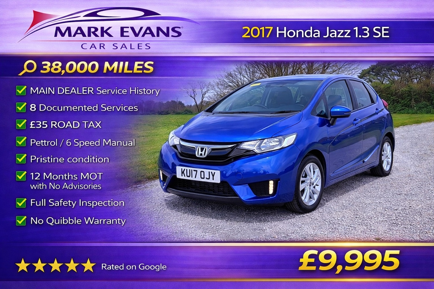 St AgnesInsurance Group 13, 38,000 MILES MAIN DEALER SERVICE HISTORY 8 DOCUMENTED SERVICES £35 ROAD TAX......This 2017 Honda Jazz 1.3 SE is a superb low mileage example with just 38,000 MILES from new, supported by a MAIN DEALER SERVICE HISTORY with 8 DOCUMENTED SERVICES. It is presented in pristine condition both inside and out and has clearly been very well maintained......The vehicle will be supplied with a brand new 12 MONTH MOT with NO ADVISORIES, a NO QUIBBLE WARRANTY, a full professional valet and a complete safety inspection, giving total peace of mind......Powered by the reliable 1.3 petrol engine with 6 speed manual gearbox, this Jazz offers a smooth, refined and economical drive. Renowned for its reliability, practicality and clever interior space, it is an ideal choice for both everyday use and longer journeys......With its low running costs, excellent fuel economy and just £35 ROAD TAX, this Jazz is a perfect option for anyone looking for dependable and cost effective motoring......At £9,995, this is a fantastic opportunity to purchase a low mileage, well maintained and highly desirable example......We specialise in sourcing the very best low mileage high quality vehicles. Mark Evans Car Sales is based in St Agnes Cornwall TR5 0PA. We pride ourselves on our honesty integrity and five star service. Please take a moment to read our five star Google reviews, we are very proud of them. The Evans family has been in the motor trade in Cornwall for over 50 years and we continue to work hard to uphold our reputation for quality and trust.