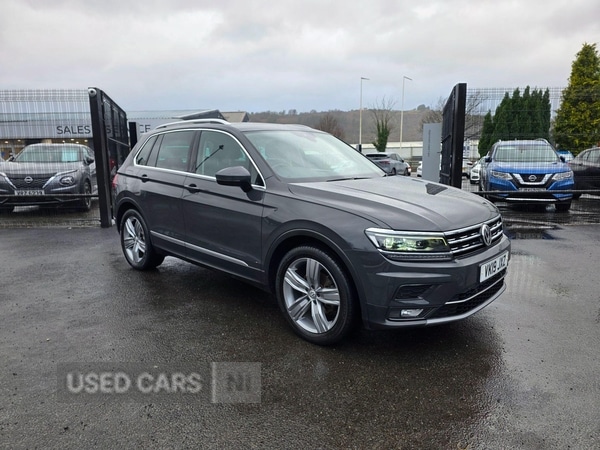 NewryInsurance Group 16, 1 Previous Owner, Discover this 2019 Volkswagen Tiguan TDI SEL, a well maintained example offering a refined driving experience. This Four Wheel Drive model is powered by an efficient 2.0 litre diesel engine and meets Euro 6 emission standards. Inside, you will appreciate the spacious cabin featuring front sports seats with 14 way adjustment for the driver, including memory settings, and a Composition Media system with Bluetooth connectivity. Enjoy the open air with the panoramic sunroof, and navigate tight spaces with ease thanks to front and rear parking sensors. Adaptive cruise control adds to the relaxed driving experience.This Tiguan SEL stands out with its impressive large boot space, perfect for all your luggage or shopping needs. Its low CO2 emissions highlight its environmental consideration, and it sits in a low insurance group, making it an economical choice for many drivers. These factors indicate that this Volkswagen Tiguan offers a more advantageous ownership proposition compared to other vehicles in its class. 12V Socket Luggage Compartment, 12V Socket in Centre Console in Storage Area, 12V Socket on Rear of Front Centre Armrest, 18 Degree Angle of Approach, 19in Alloy Wheels Victoria, ABS AntiLock Braking System, Active Bonnet, Active Info Display, Adaptive Cruise Control, Airbags, Alarm with Interior Protection with Deactivation via Infotainment System, Ambient Lighting, Automatic ComingLeaving Home Lighting Function, Automatic Dimming Rear View Mirror, Automatic Hazard Light Activation Under Heavy Braking, Black Grained Lower Door Protectors with Chrome Insert, Body Coloured Bumpers and Door Handles, BodyColoured Door Mirrors with Integrated Indicators, CarNet App Connect, CarNet Guide and Inform (3 Year Subscription From New), Carpet Mats Front and Rear, Chrome Side Window Surrounds, Chrome Trim on Radiator Grille Upper and Lower, Chrome Trimmed Front Air Intake Strip, Climate Control 3Zone Electronic Air Conditioning with Automatic Air Recirculation, Coasting Function, Composition Media System, Cup Holders Front x2, Dark Grey Decorative Inserts in Dash and Door Panels, Discover Navigation TouchScreen NavigationRadio System with CarNet Guide and Inform, Driver Alert System, Driver Profile Selection Choice of Three Settings Eco Normal and Sport Modes, Drivers and Front Passengers Under Seat Drawer, Drivers and Passengers Safety Optimised Head Restraints, Dusk Sensor Automatic Driving Lights, Dynamic Light Assist, ESC
