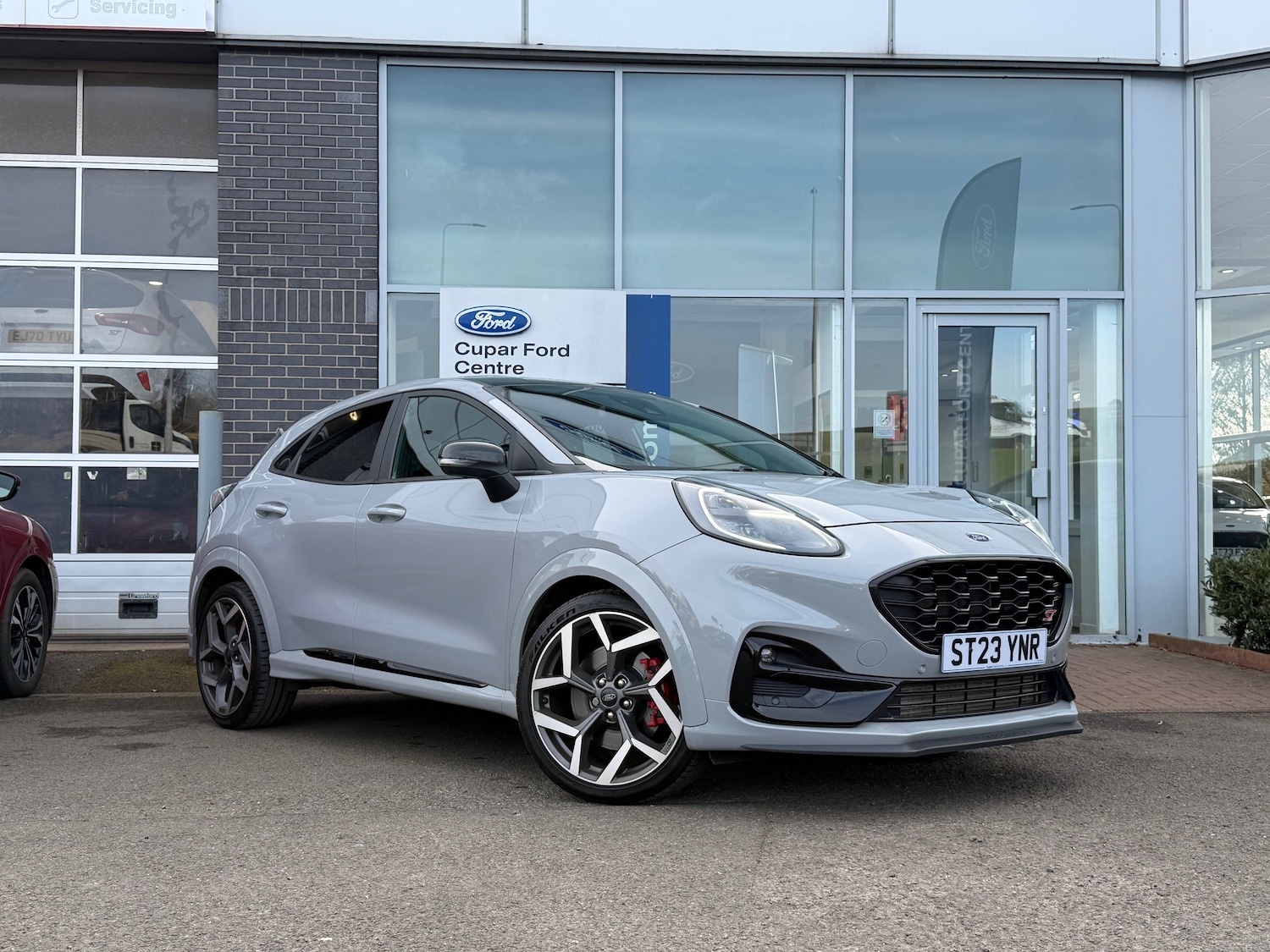 1 Previous Owner, 3 rear seatbelts, Autonomous emergency braking, Child safety lock, Electronic stability control (ESC) and hill start assist, Pedestrian/cyclist detection and postcollision braking, Pre collision assist system, Red brake calipers, Tyre pressure monitoring system (TPMS), Cruise control with Intelligent speed assist, Driver impairment monitor, Emergency call service, Ford easy fuel, Front and rear parking sensors, Full digital 12.3 inch instrument cluster, Lane keeping aid with lane departure warning, Manual tailgate, Power assist steering, Selectable drive modes (normal, sport, eco, track), Speed sign recognition, Automatic headlights with auto high beam, Automatic rain sensing wipers, Body coloured door mirrors, Body coloured roof, Dual chrome exhaust, Fixed LED signature headlamps, Front fog lamps, Large rear spoiler, LED daytime running lights, LED rear lamps, Power foldable heated door mirrors with puddle lamps and puma logo protection, Premium paint, Privacy glass to side rear windows and tailgate glass, Quickclear heated windscreen, Rear side wing doors, Rear wiper, ST scuff plates, Third brake light, Unique ST body styling kit including wing mirrors and Ford Performance embossed splitter, 3 seat bench in 2nd row, Alloy sports pedals, Centre console with armrest and stowage, Ford megabox extended bootspace, Ford Performance sensico partial premium leather upholstery with metal grey stitching, Front and rear floor mats, Front and rear head restraints, Manual 6 way driver seat adjust with lumbar adjustment, Manual 6 way passenger seat with lumbar seat adjustment, Single front passenger seat, ST flat bottomed steering wheel with metal grey stitching, ST logo projection, Unique ST gear shift knob, Wireless charging pad with electronic air temperature control (EATC), BandO Premium Audio system + Ford SYNC 3 navigation pack Puma, Winter pack Puma, Engine sound enhancer, ST suspension, Carbon look interior deco spears, Keyless entry and power start button, Thatcham alarm, 19 inch 5 Spoke magnetite dark finished alloy wheel, Tyre inflation kit