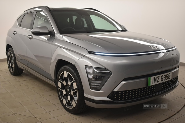 Belfast0 Previous Owners, The Hyundai KONA 160kW Ultimate 65kWh Auto offers a refined electric driving experience, ideal for those seeking an efficient and wellequipped vehicle with very low mileage recorded at just 2,580 miles. The automatic transmission ensures an effortless drive, while the ECO leather and suede upholstery, ventilated and heated seats, and dualzone climate control provide notable comfort for every journey. The inclusion of an electric sunroof, privacy glass, and a host of advanced convenience features such as a heightadjustable power tailgate and rear centre armrest with cupholders, further enhance everyday practicality.With a powerful 218 bhp electric motor, the KONA delivers responsive acceleration, achieving 060 mph in just 7.8 seconds. The top speed of 107 mph highlights the vehicle's strong motorway capability, making it suitable for both urban and longer distance driving. The shiftbywire system, intelligent cruise control with stop and go, and highway drive assist contribute to a smooth and composed performance.Styling is distinguished by its silver paintwork, N Line interior and exterior detailing, satinfinished beltline, and roof rails, providing a modern and cohesive appearance. Key exterior elements include bodycoloured wheel arch inserts, door handles and mirrors, LED projector headlights, LED turning signals, and a rear roof spoiler with integrated LED brake light. The combination of privacy glass, tinted windows, and solar glass for the windscreen and doors not only creates a stylish look but also improves cabin comfort in varying conditions.The KONA's specification is comprehensive, featuring a 12.3inch touchscreen with satellite navigation, live services, and smartphone integration for both Apple CarPlay and Android Auto. Driver aids such as a surround view monitor, rear parking camera, front and rear parking sensors, headup display, lane keeping assist, blind spot monitoring, and advanced collision avoidance systems ensure enhanced safety and convenience. Additional amenities include wireless phone charging, heated steering wheel, luggage compartment LED lighting, a heat pump, and intelligent keyless entry with stop/start button, contributing to a highly practical and comfortable ownership experience